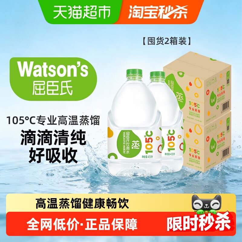 📚 屈臣氏蒸馏制法饮用水4.5L*8桶大桶装整箱纯净补水护肤非矿泉