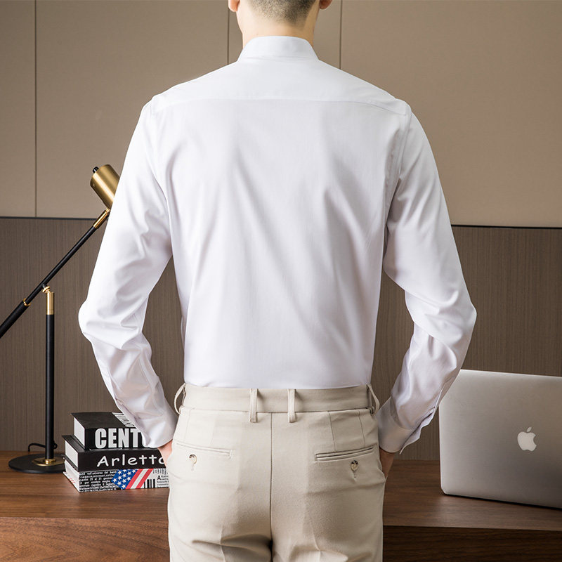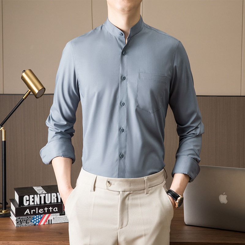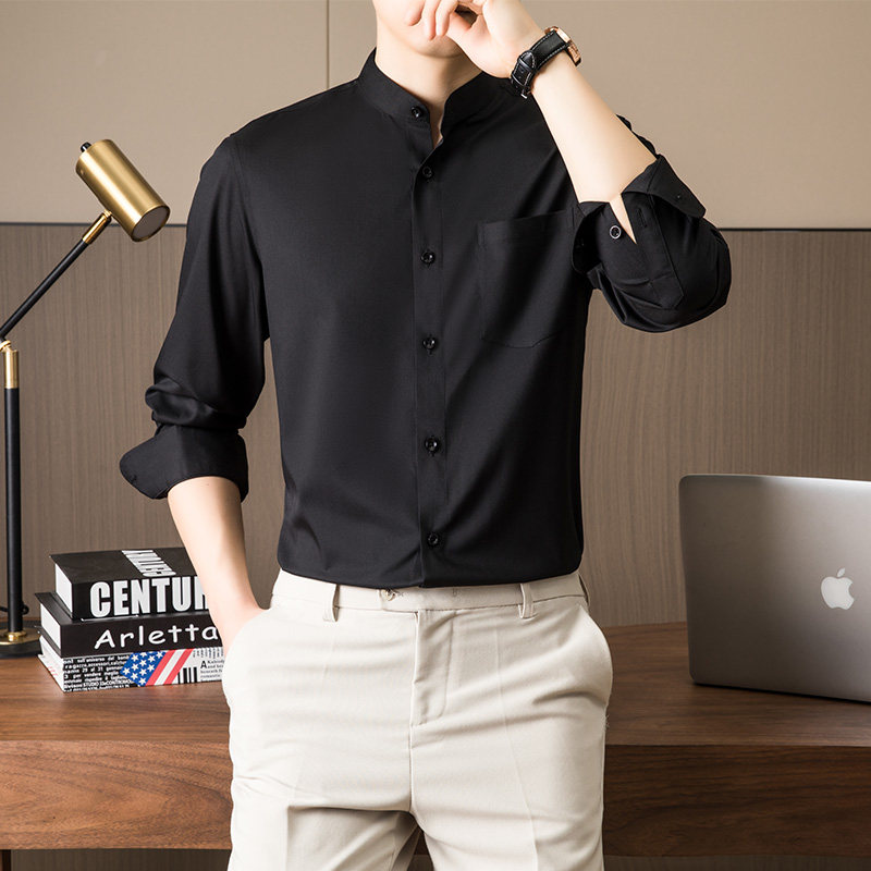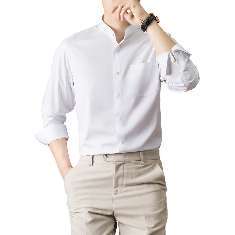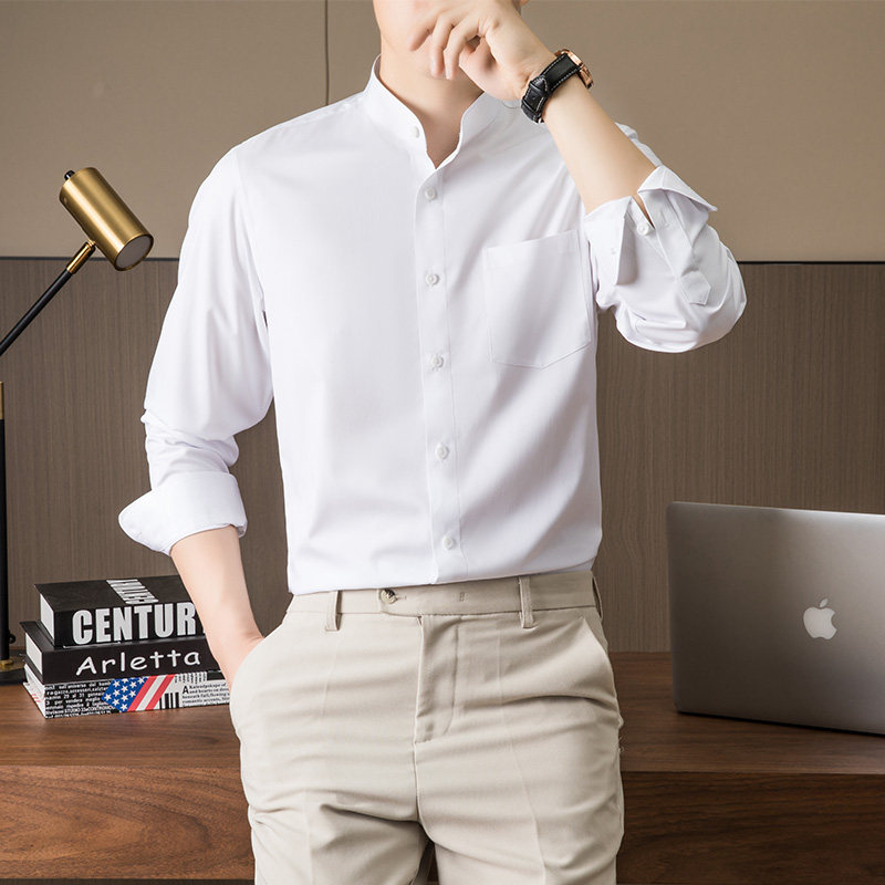 📚 白色小立领衬衫男长袖秋季短款村子弹力有口袋新中式颈无圆领衬衣