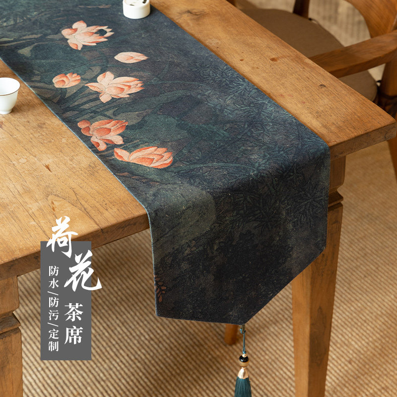 📚 爱奇葩 原创法海寺荷花茶席防水中式禅意茶桌垫布长桌布桌旗茶旗
