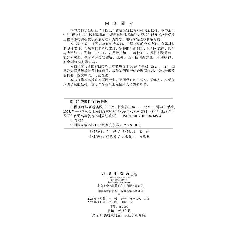 📚 【现货正版】工程训练与创新实践 王杰,伍剑波 主编 科学出版社 正版书籍 普通高等教育本科规划教材