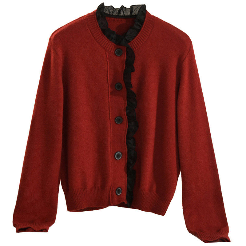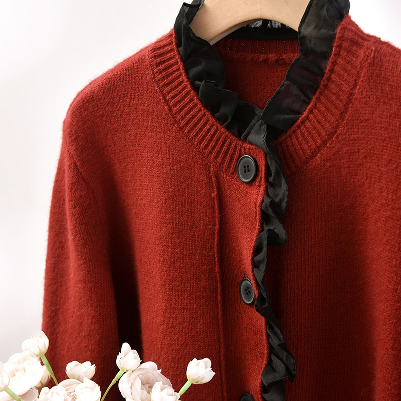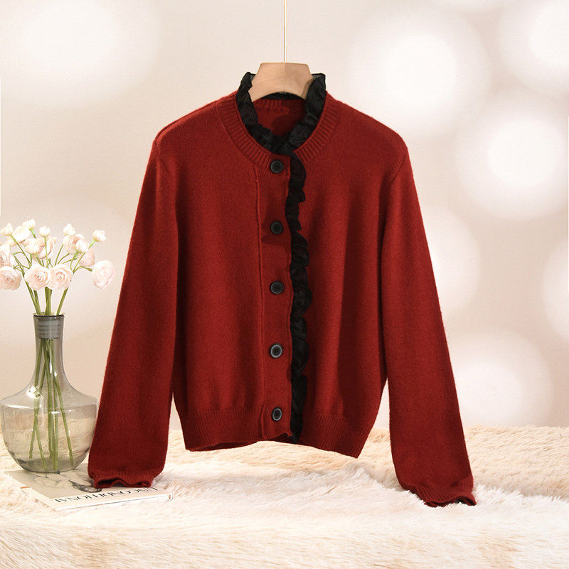 📚 奥莱专柜品牌撤柜正品 HZ冬装新款 拼接木耳边复古羊毛开衫毛衣女
