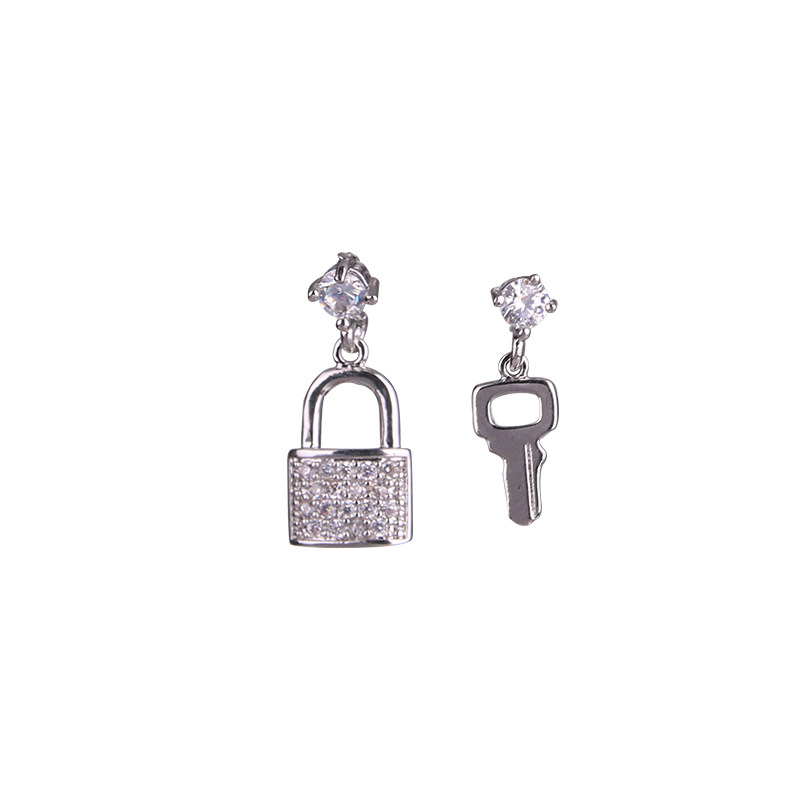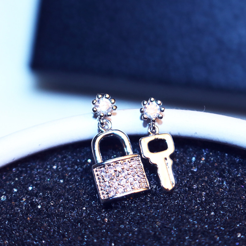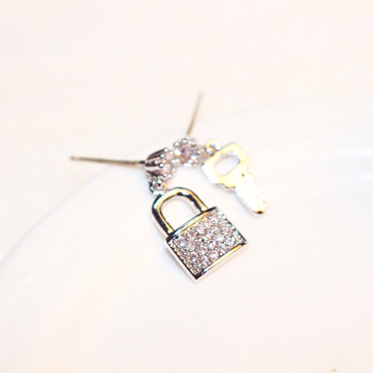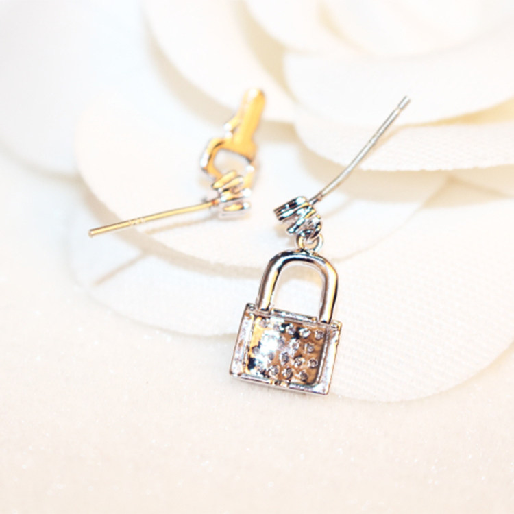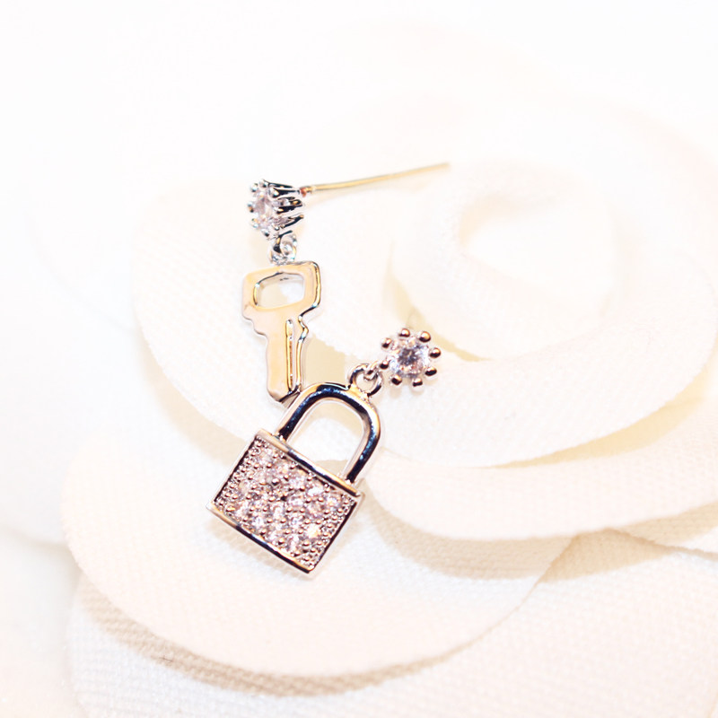 📚 925纯银耳钉小香款百搭款不对称钥匙小锁耳环耳饰明星同款
