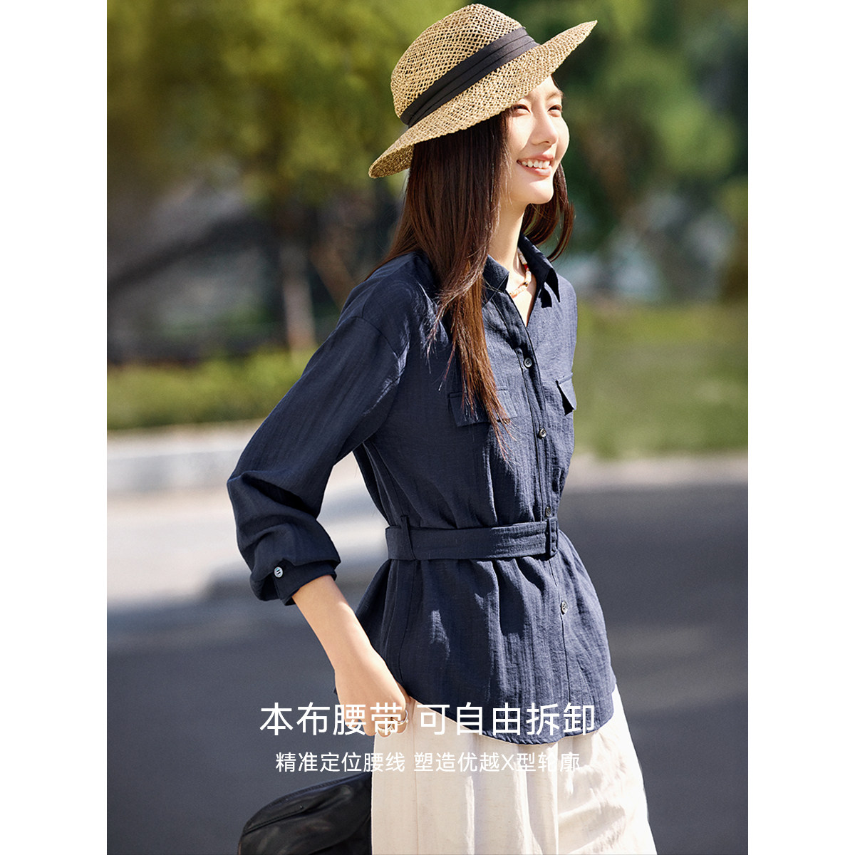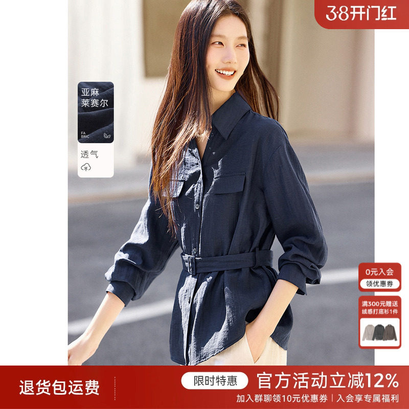 📚 XWI欣未含亚麻莱赛尔长袖衬衫女2026春季宽松收腰显瘦藏青色衬衣