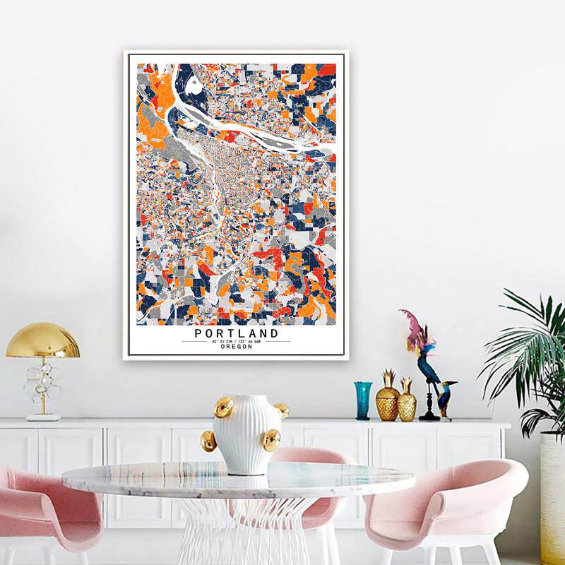 📚 波特兰 俄勒冈州美国艺术抽象城市彩色色块地图装饰画客厅墙挂画