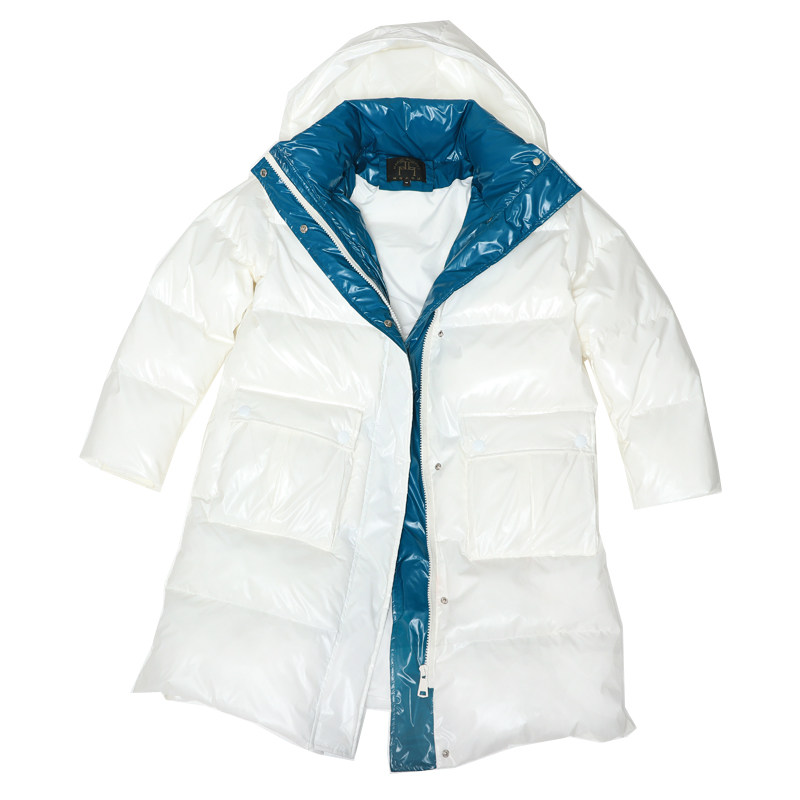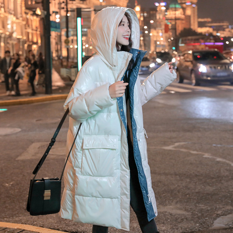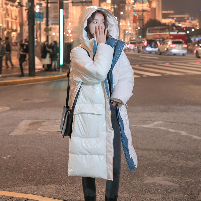 📚 白色羽绒棉服女过膝中长款2023冬季新款撞色棉衣亮面宽松连帽外套