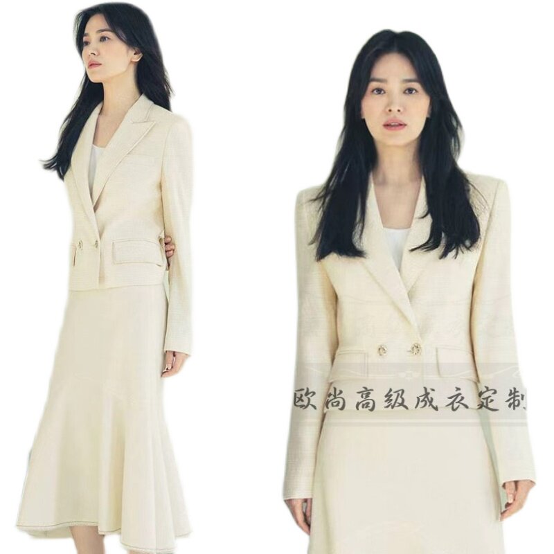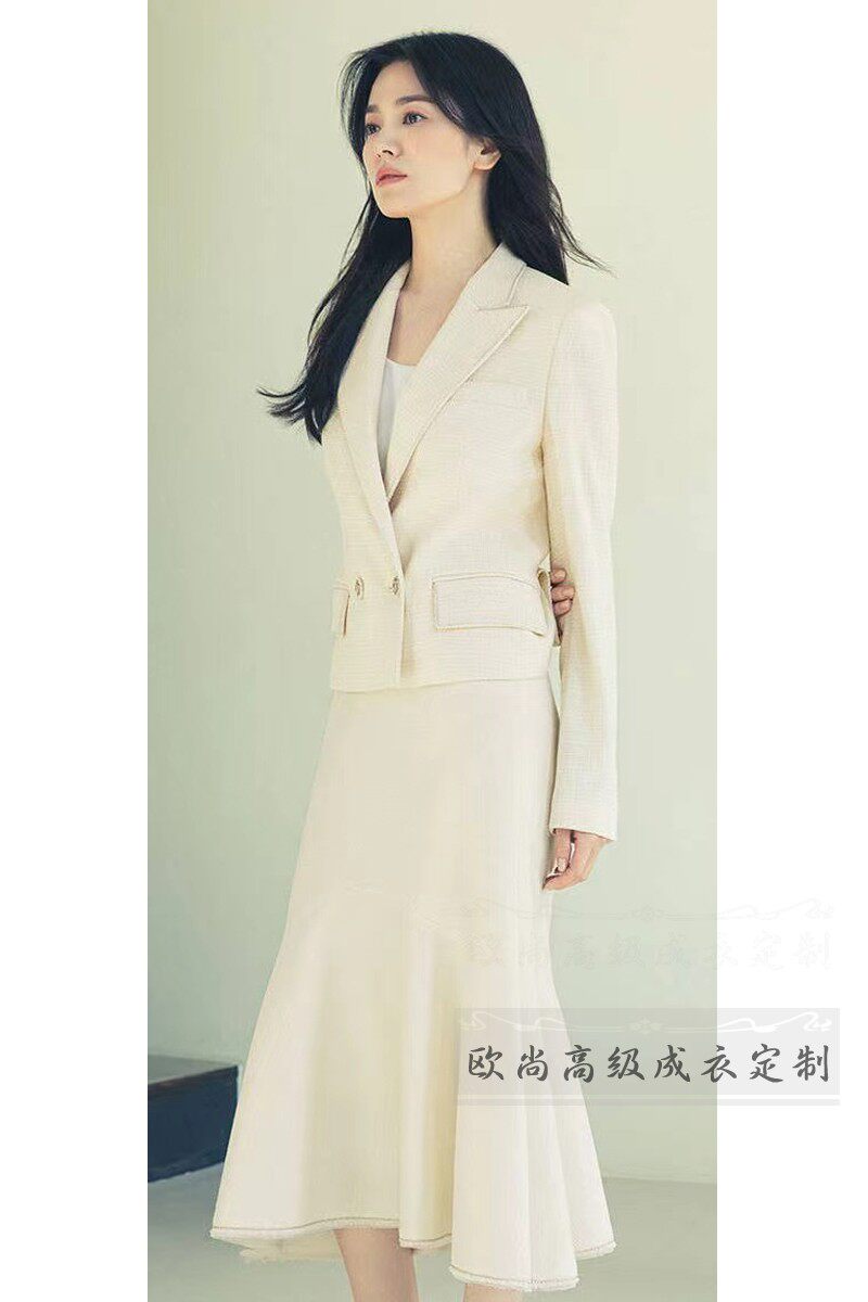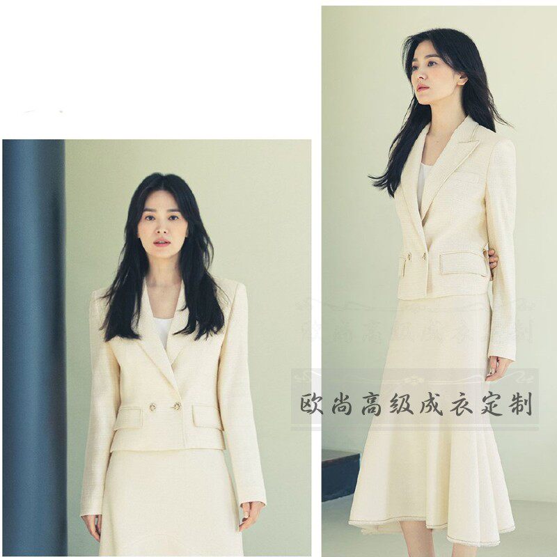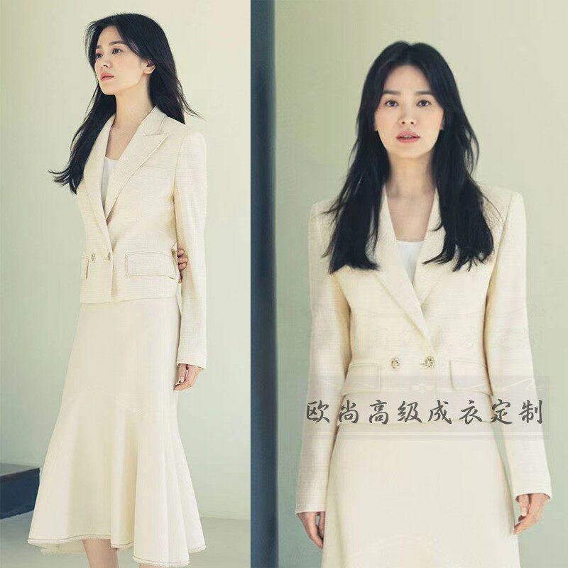 📚 高级定制明星宋慧乔同款米白色羊毛名媛气质通勤西装套装鱼尾裙秋