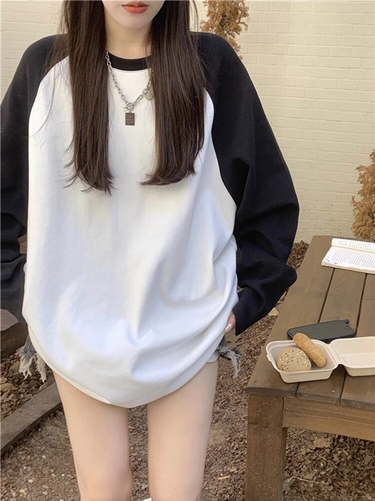 📚 黑白拼色插肩长袖纯棉t恤2026春秋装女士上衣慵懒风宽松打底小衫