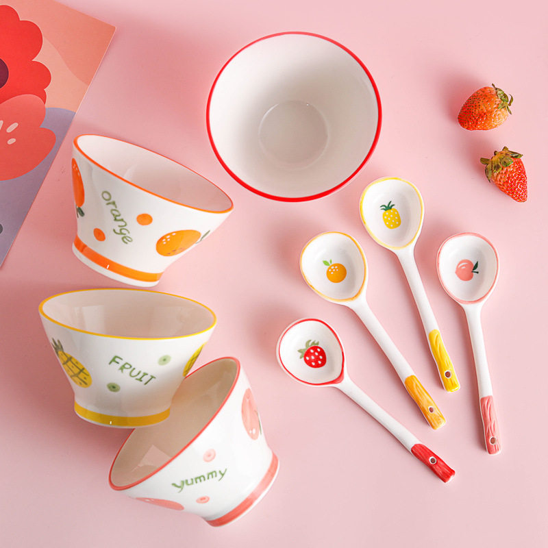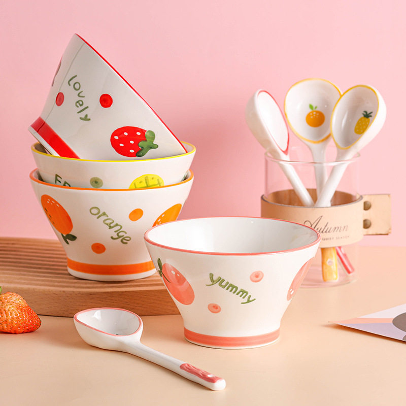 📚 釉下彩饭碗小碗可微波长柄汤勺子高脚碗斗笠碗高颜值家用陶瓷餐具