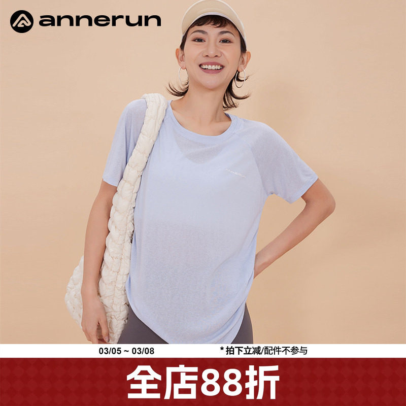 📚 annerun健身运动上衣女圆领T恤罩衫透气瑜伽T恤宽松跑步速干短袖