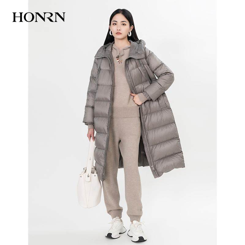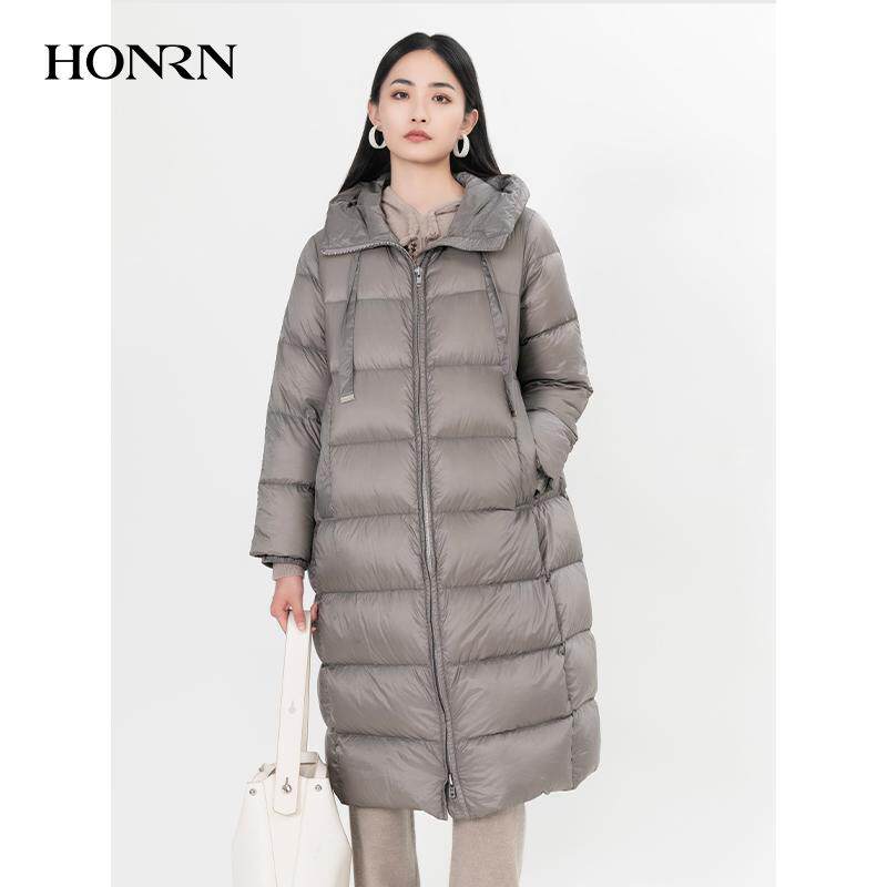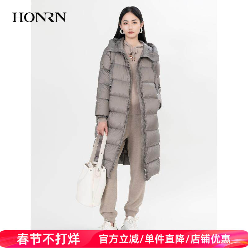 📚 HONRN/红人灰色长款轻薄白鹅绒连帽羽绒服外套女款冬季HH55YR253