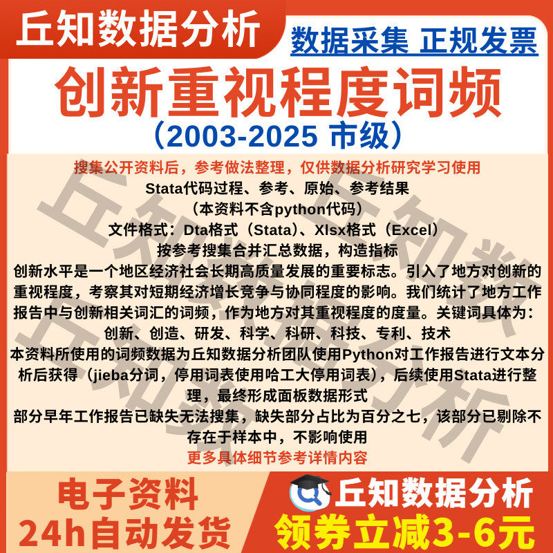 📣嗨,亲爱的小伙伴们!今天我要跟大家分享一款超级实用的数据,那就是关于创新重视程度词频统计2025-2003市级文本分析数据Stata整理的好物——券后价仅4的创新产品!
