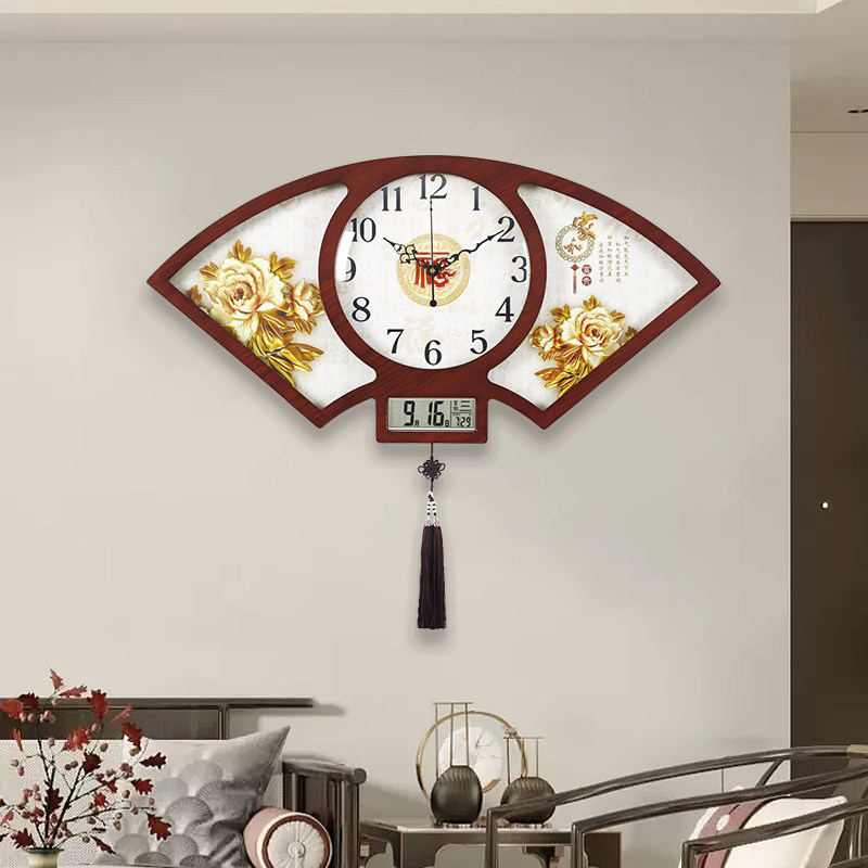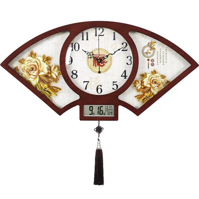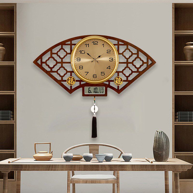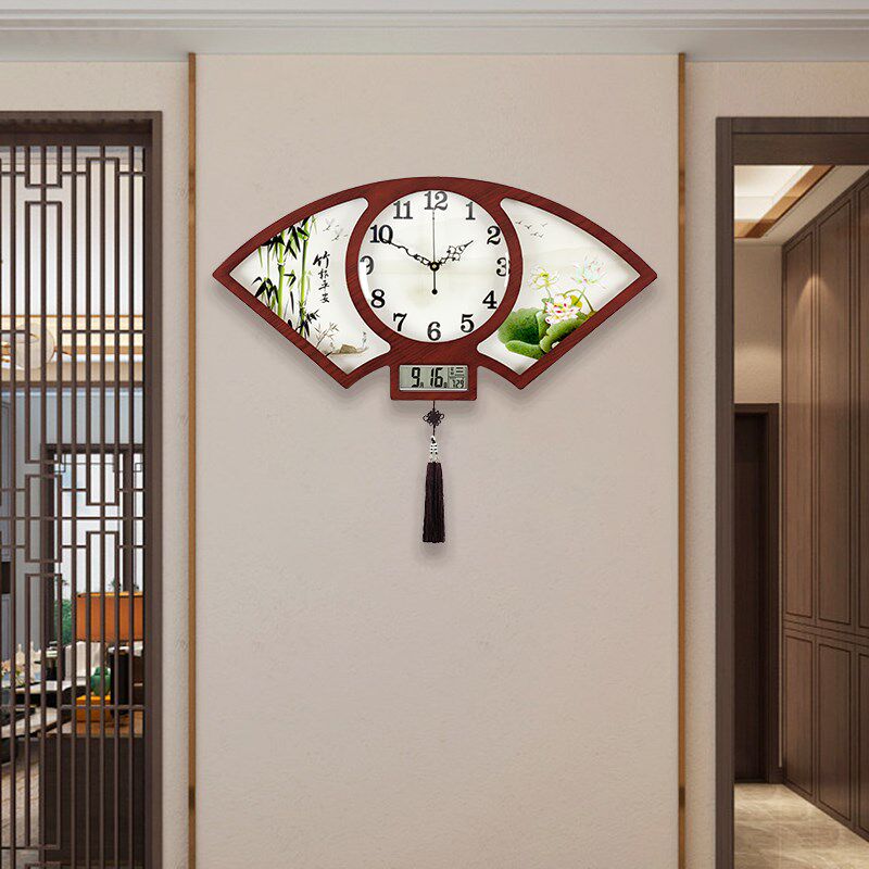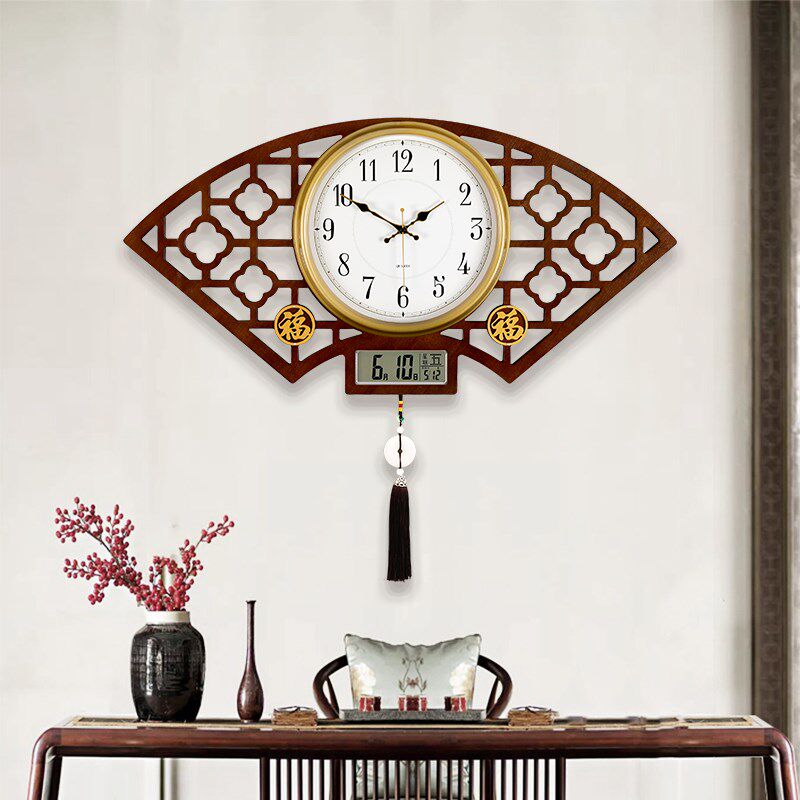 📚 新中式扇形免打孔钟表挂钟客厅万年历静音时钟创意装饰画挂表木质