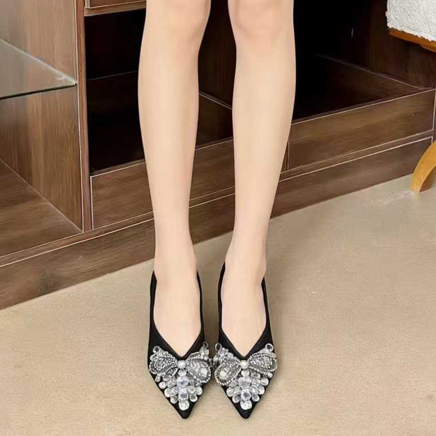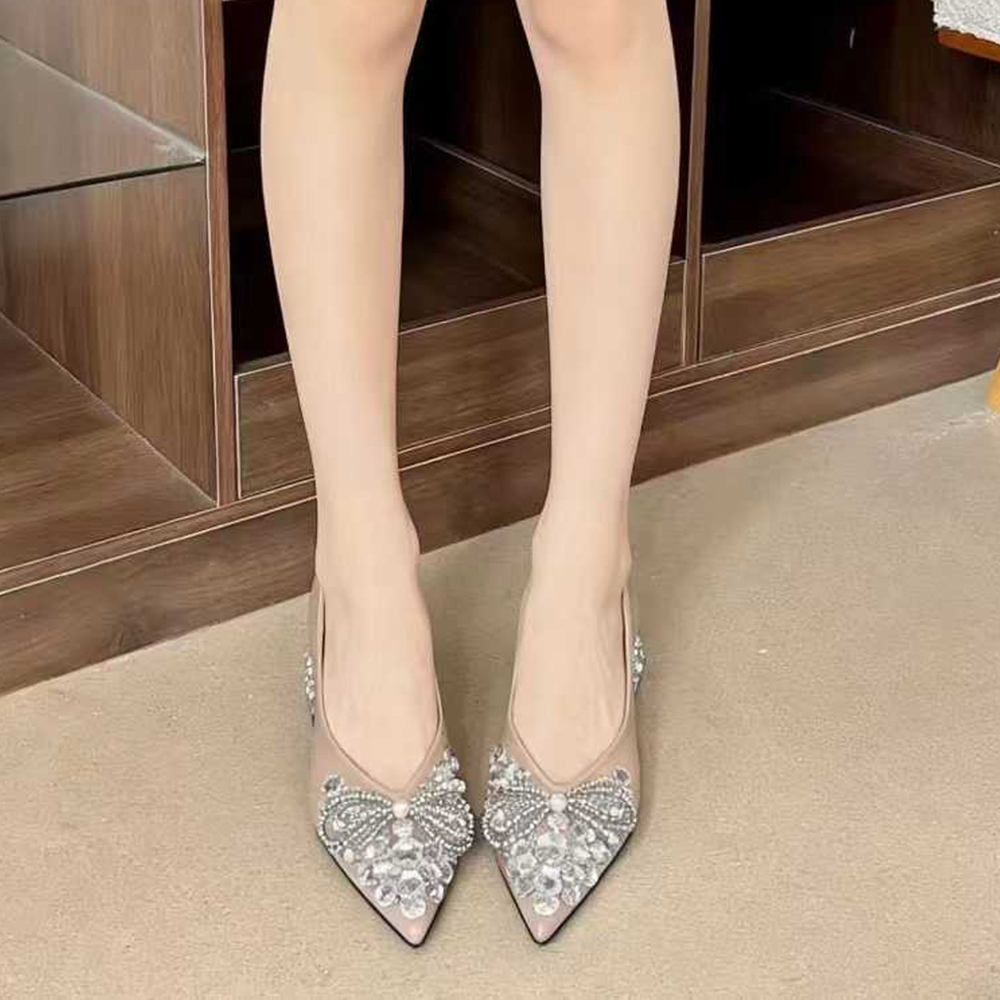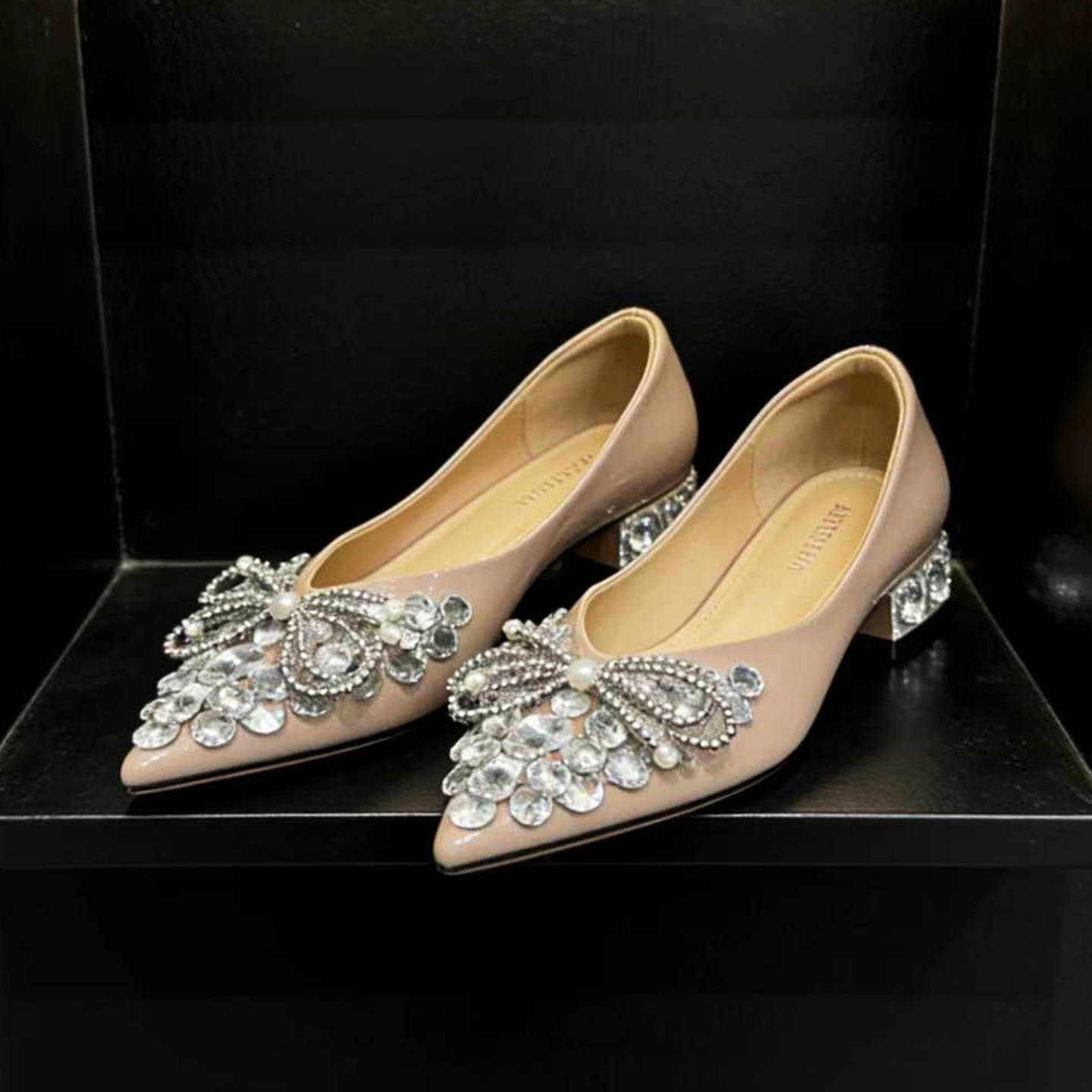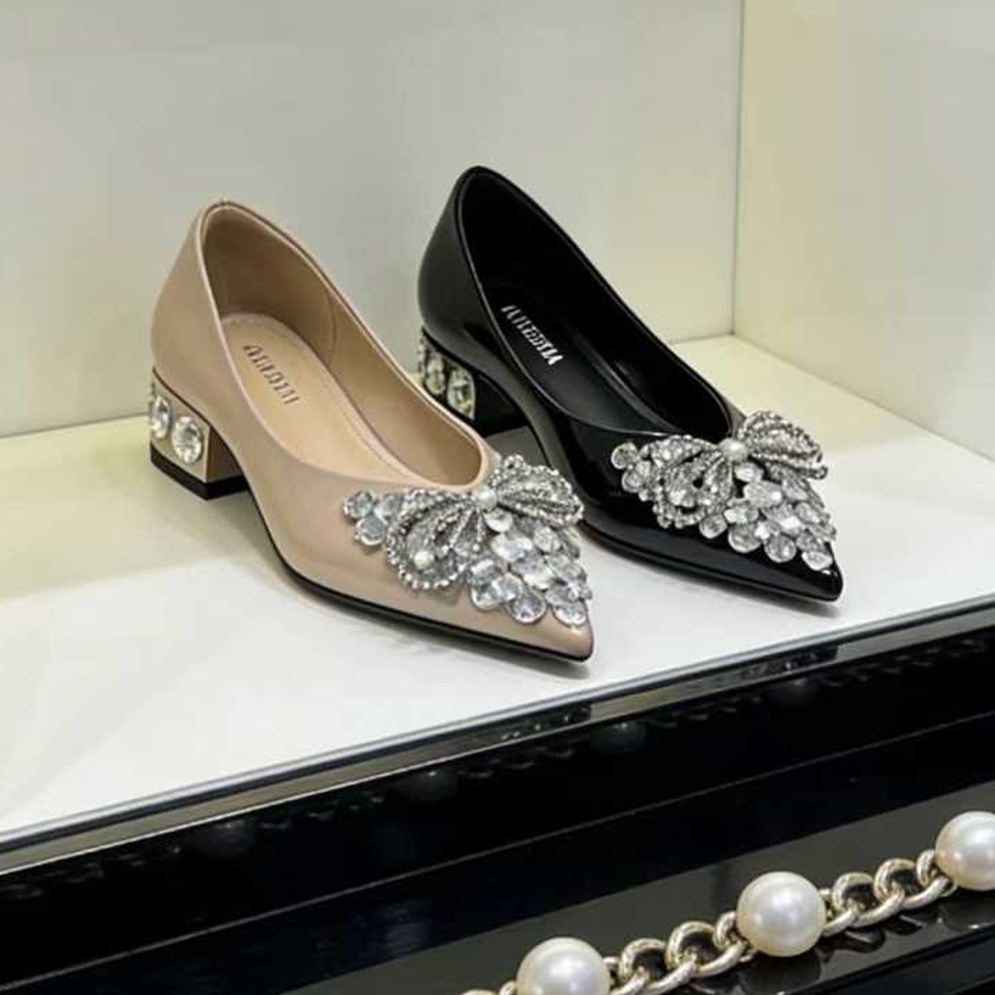 📚 纯手鱼线缝制水钻尖头粗跟中低跟浅口单鞋休闲瘦脚镶钻跟重工女鞋