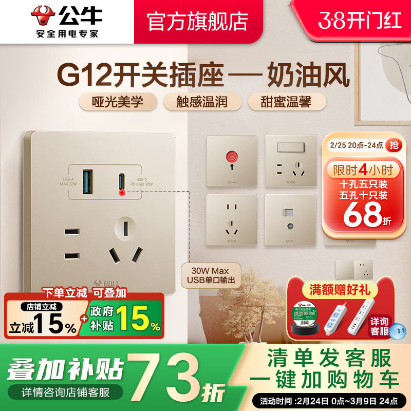 📚 公牛插座旗舰店开关插座五孔插座10A面板暗装G12星辰金奶油风
