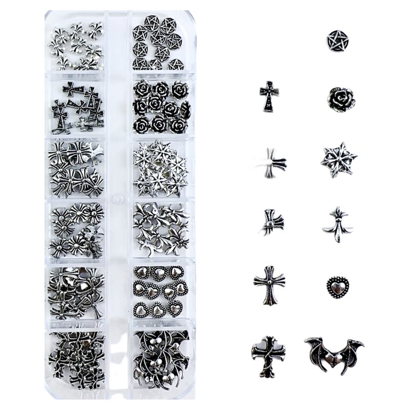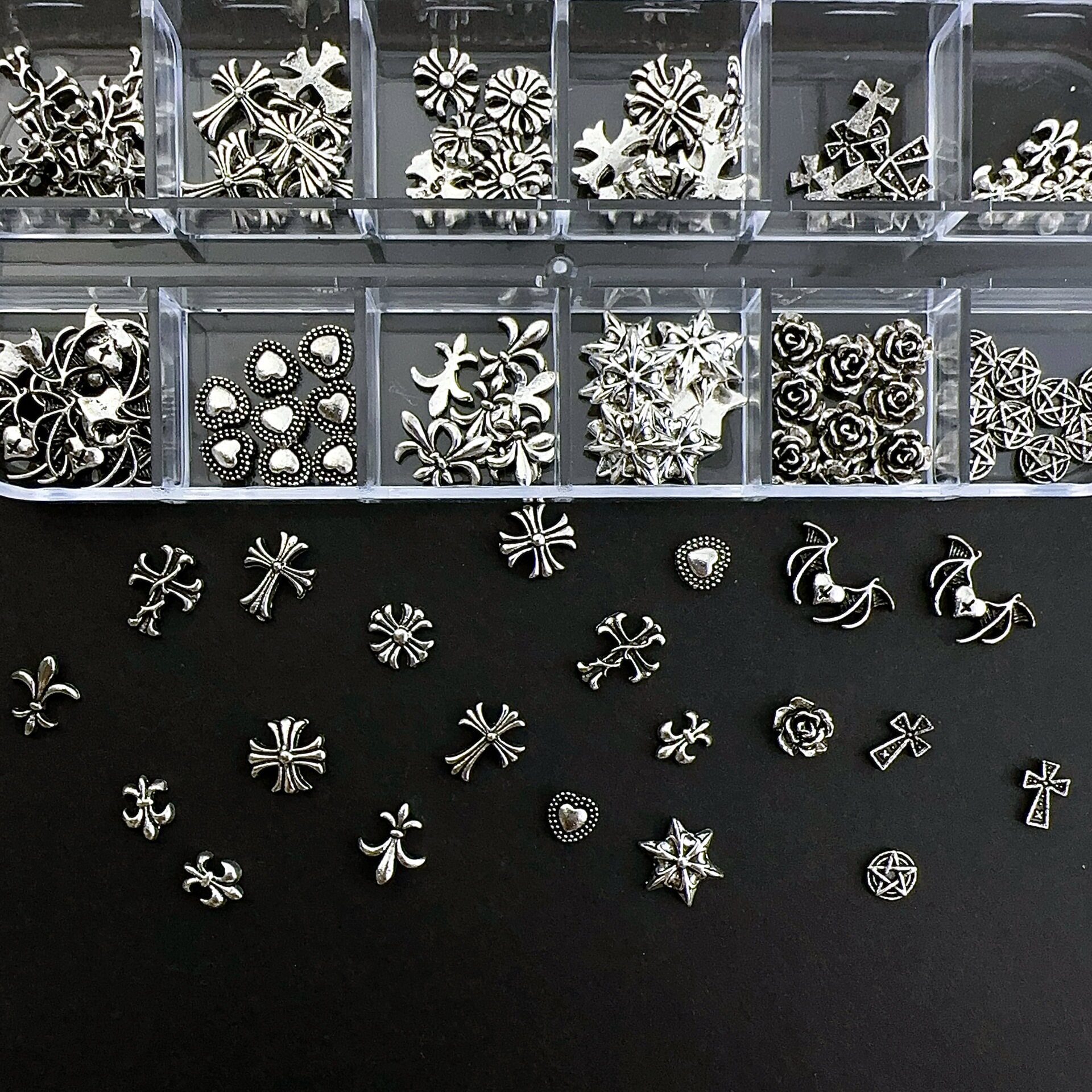 📚 120颗盒装 复古克罗心十字架银金属美甲装饰品指甲小配件混装暗黑