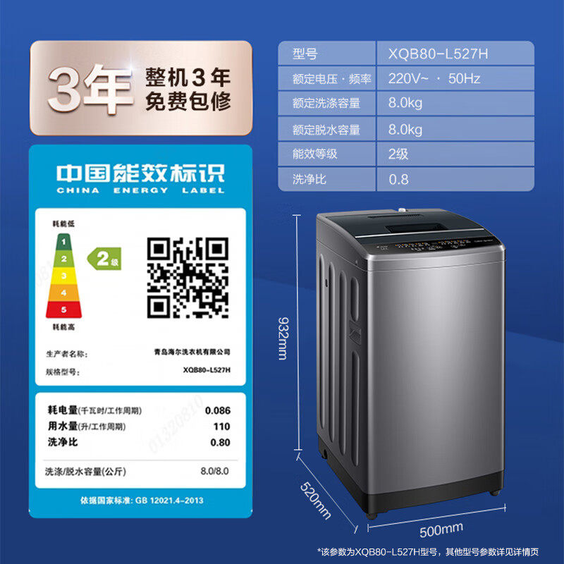 📚 海尔智家出品统帅8/10kg大容量家用全自动波轮洗衣机XQB100-L527H