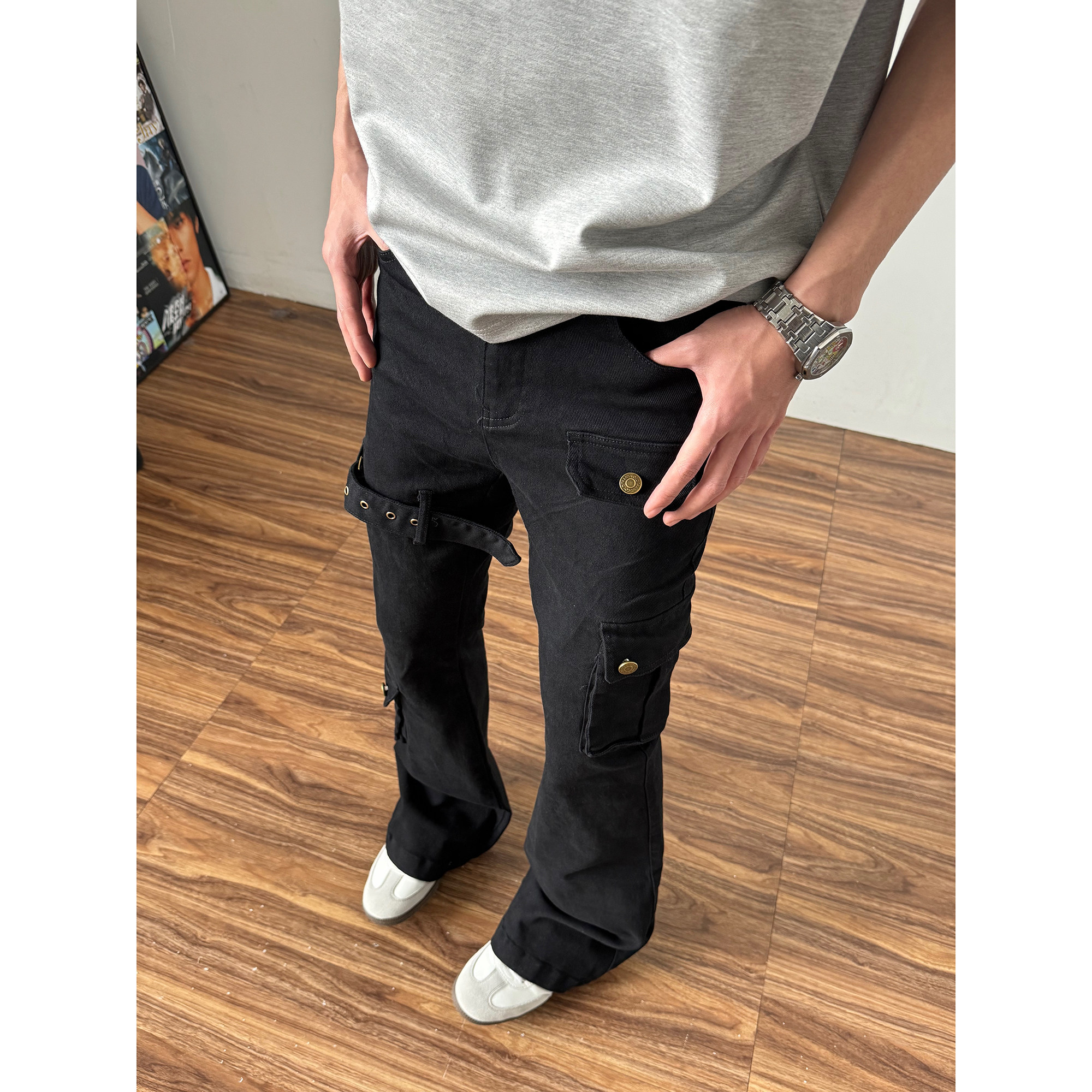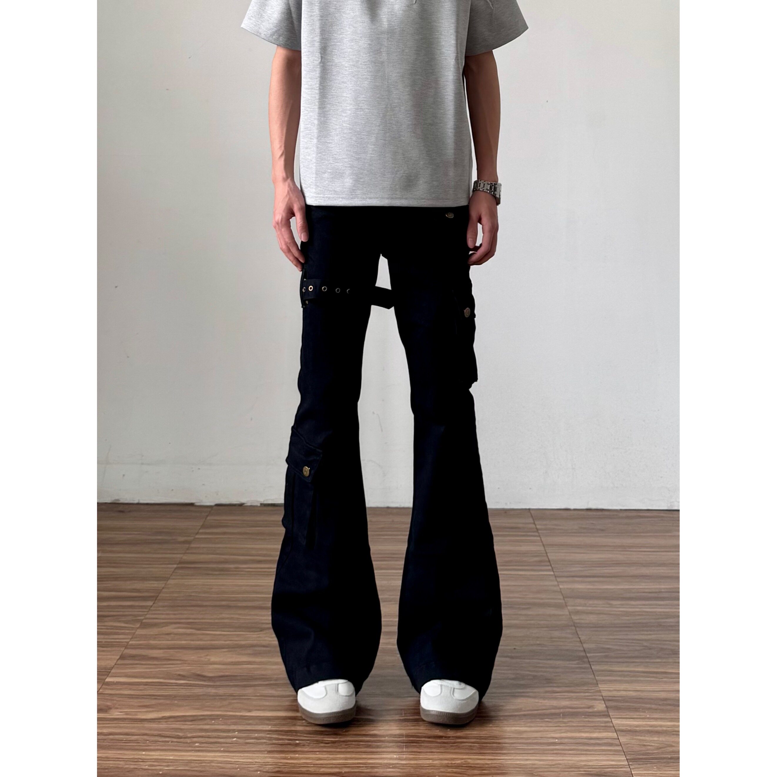 📚 黑色vibe绑带微喇工装牛仔裤男cleanfit美式高街修身喇叭裤子秋季