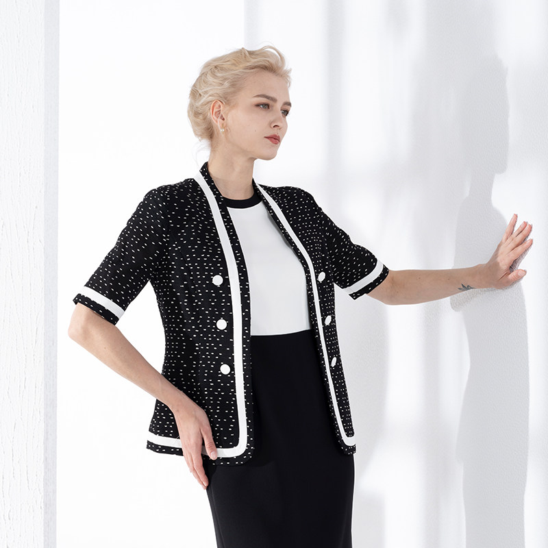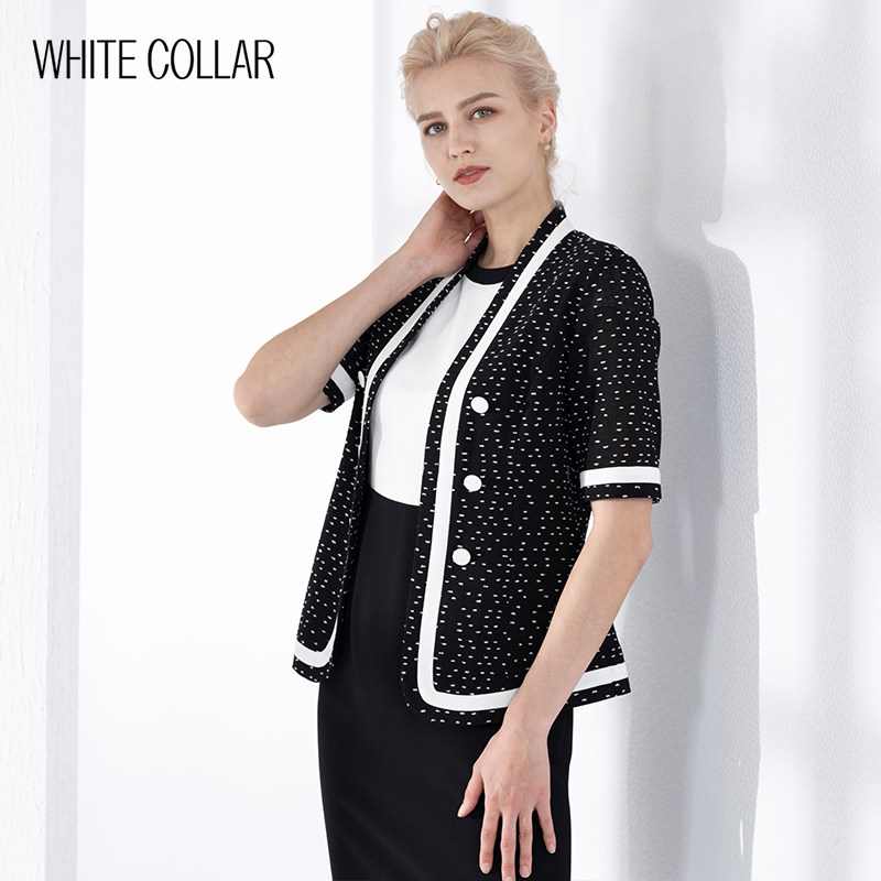📚 白领女士黑白点拼白边爬领双排白扣挂勾短袖上衣TD22-601