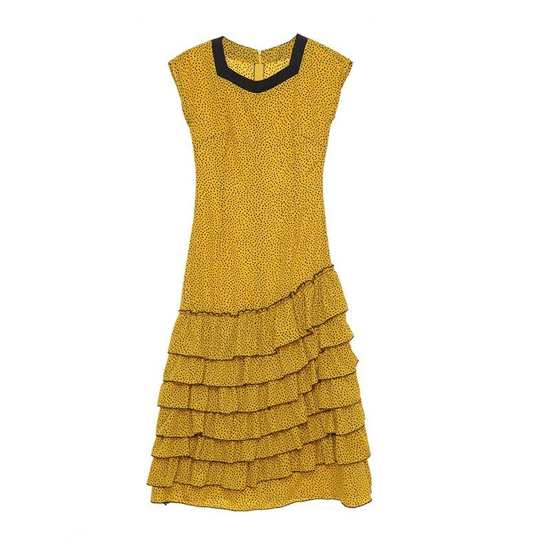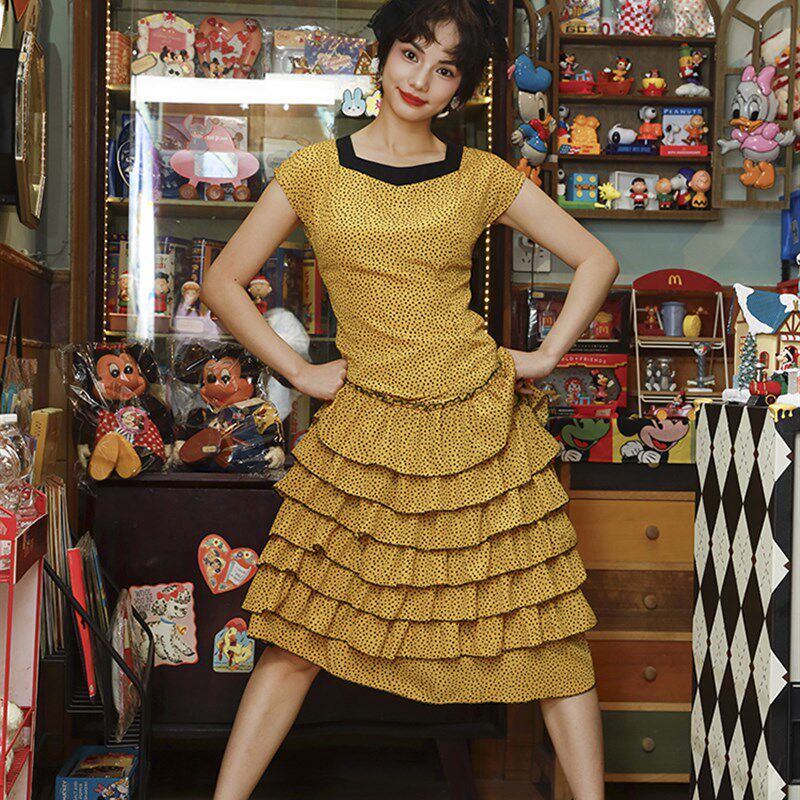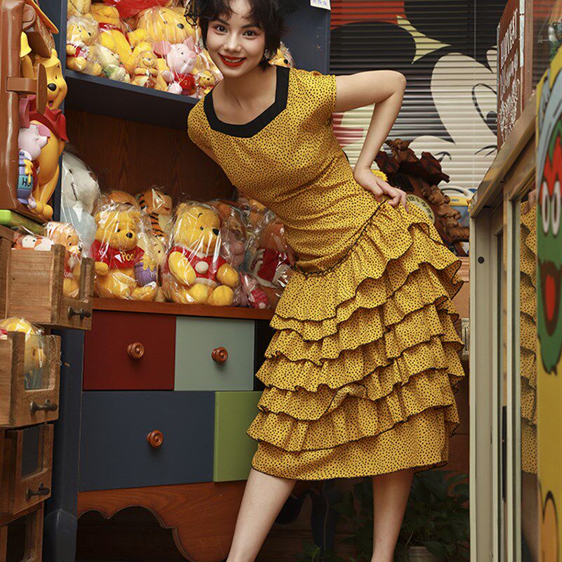 📚 南君梦盒法式复古方领俏皮可爱黄黑波点裙蛋糕裙穿长裙新款