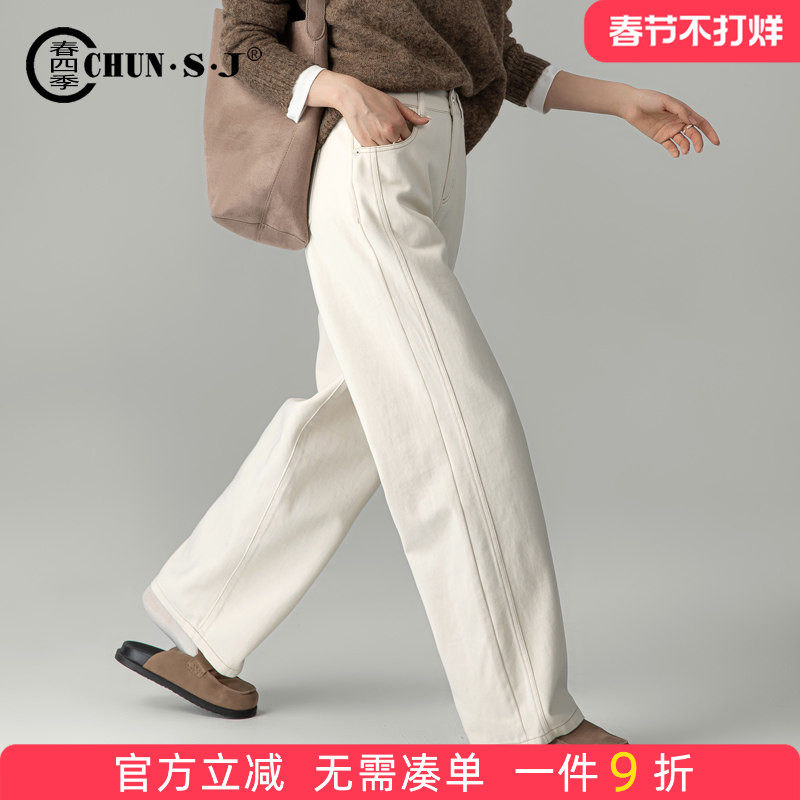 📚 米白色窄版阔腿牛仔裤女2025秋冬新款加绒女裤显瘦弯刀裤直筒裤子