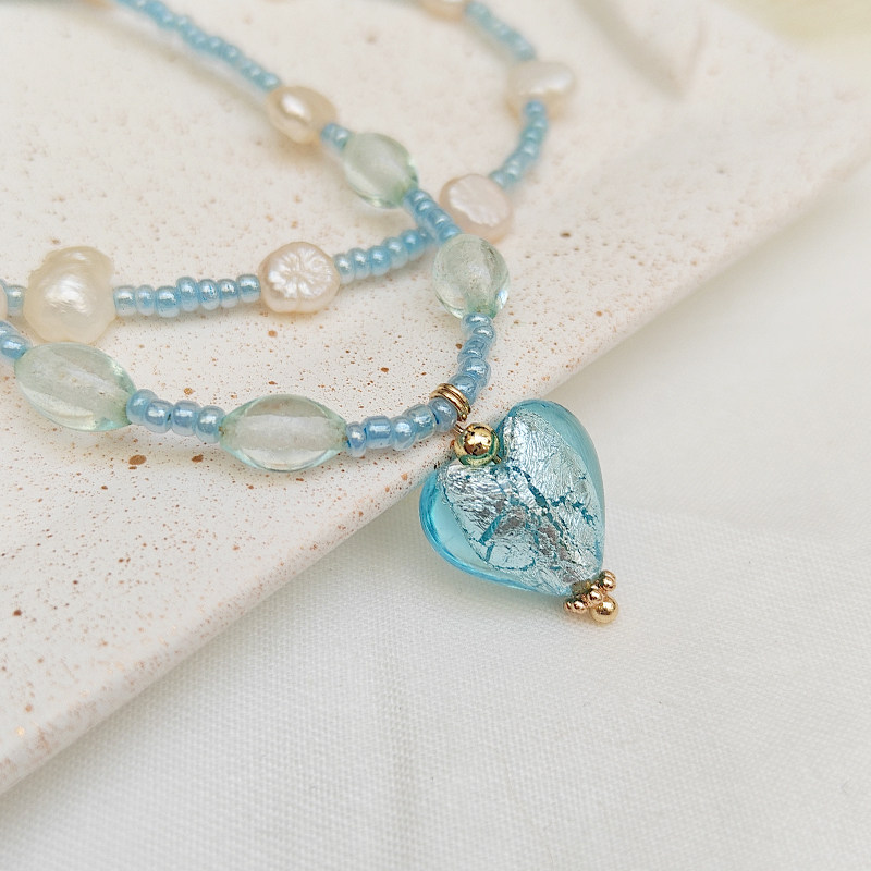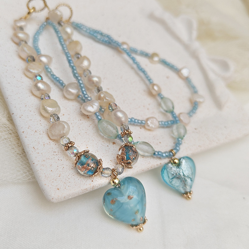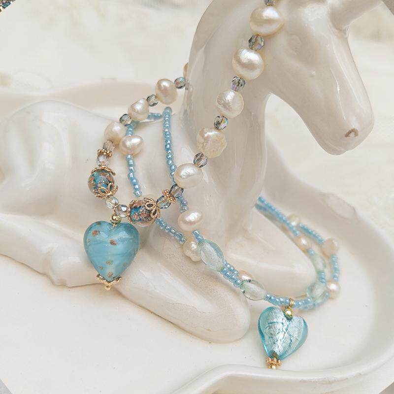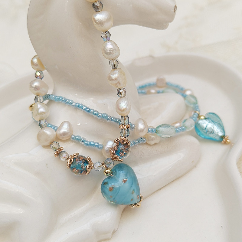 📚 意大利穆拉诺天蓝色爱心琉璃珍珠手链 中古vintage老珠清新小众