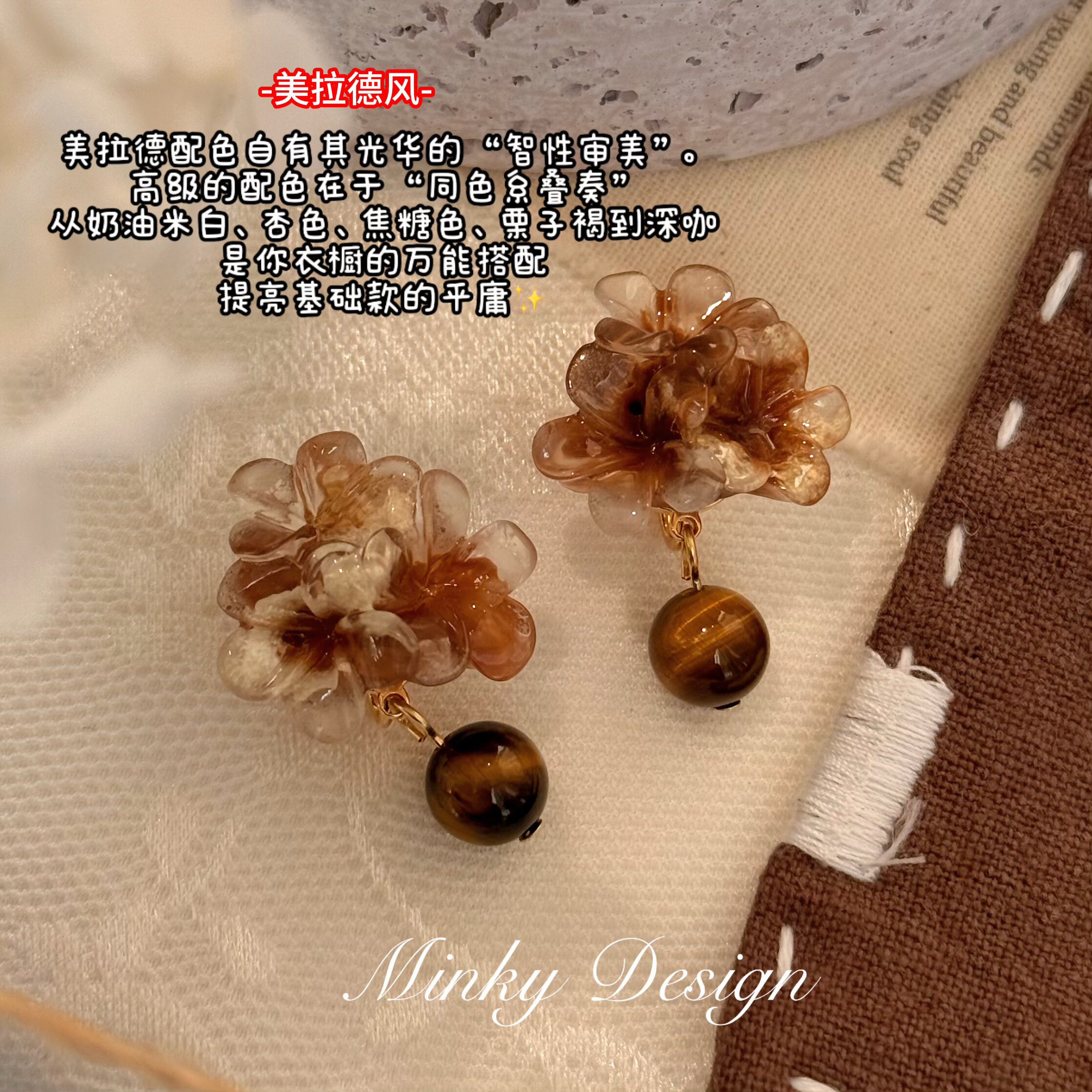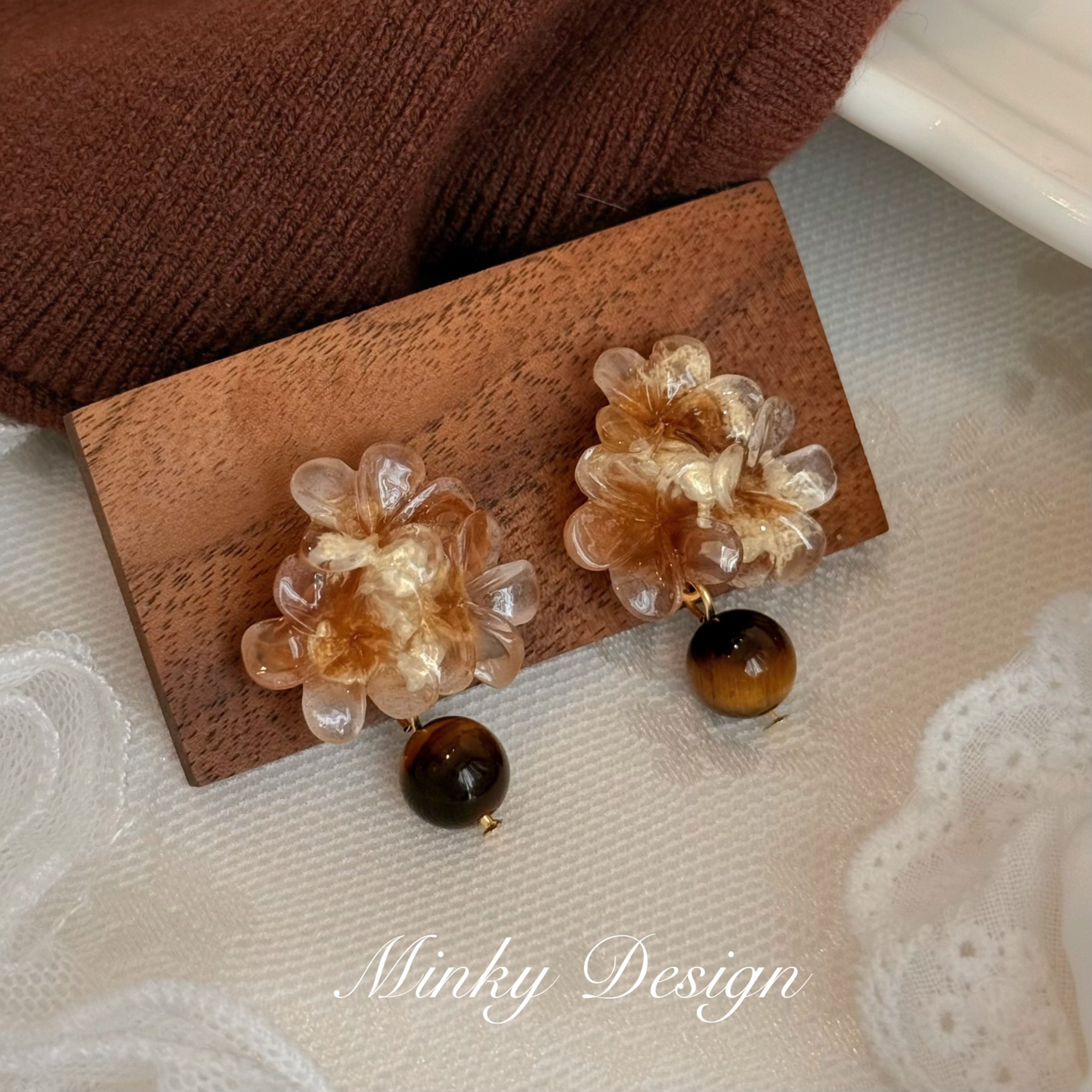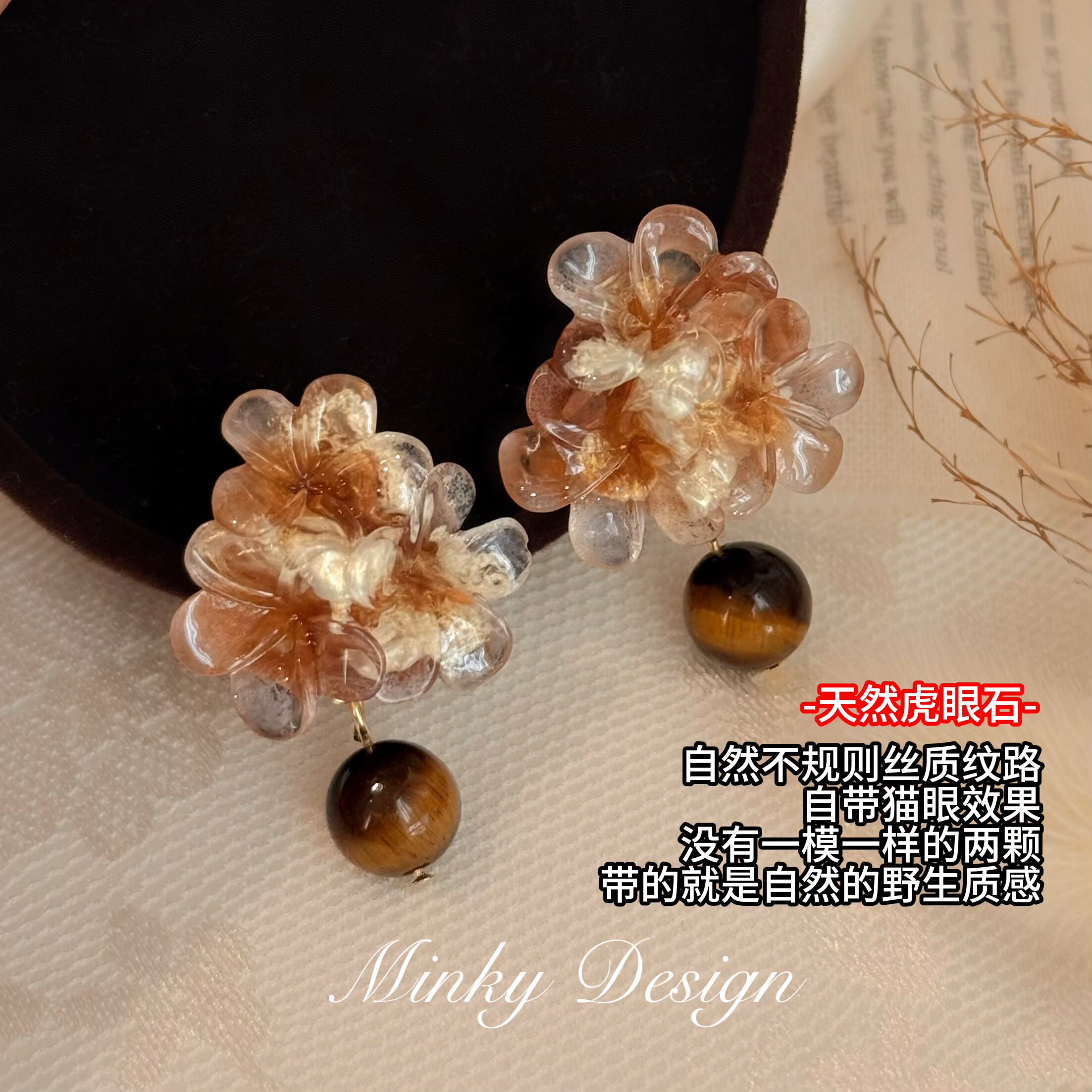 📚 「花漾虎睛」秋冬高级感花朵耳钉蚊香盘耳夹无耳洞虎眼石耳环耳饰