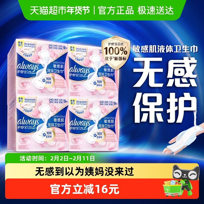 67¥ CA381 4rCcUlizYNp¥ https://m.tb.cn/h.7vHVmKf 护舒宝敏感肌液体卫生巾日用240mm 36片超薄透气姨妈巾官方正品 --------------------- 【原售价】159.6元 【现售价】94.9元。