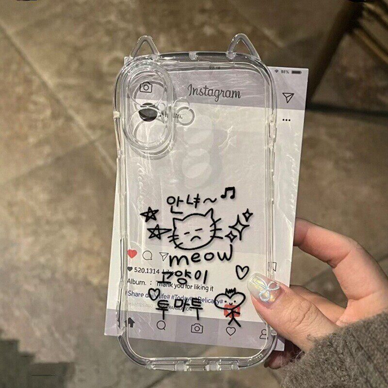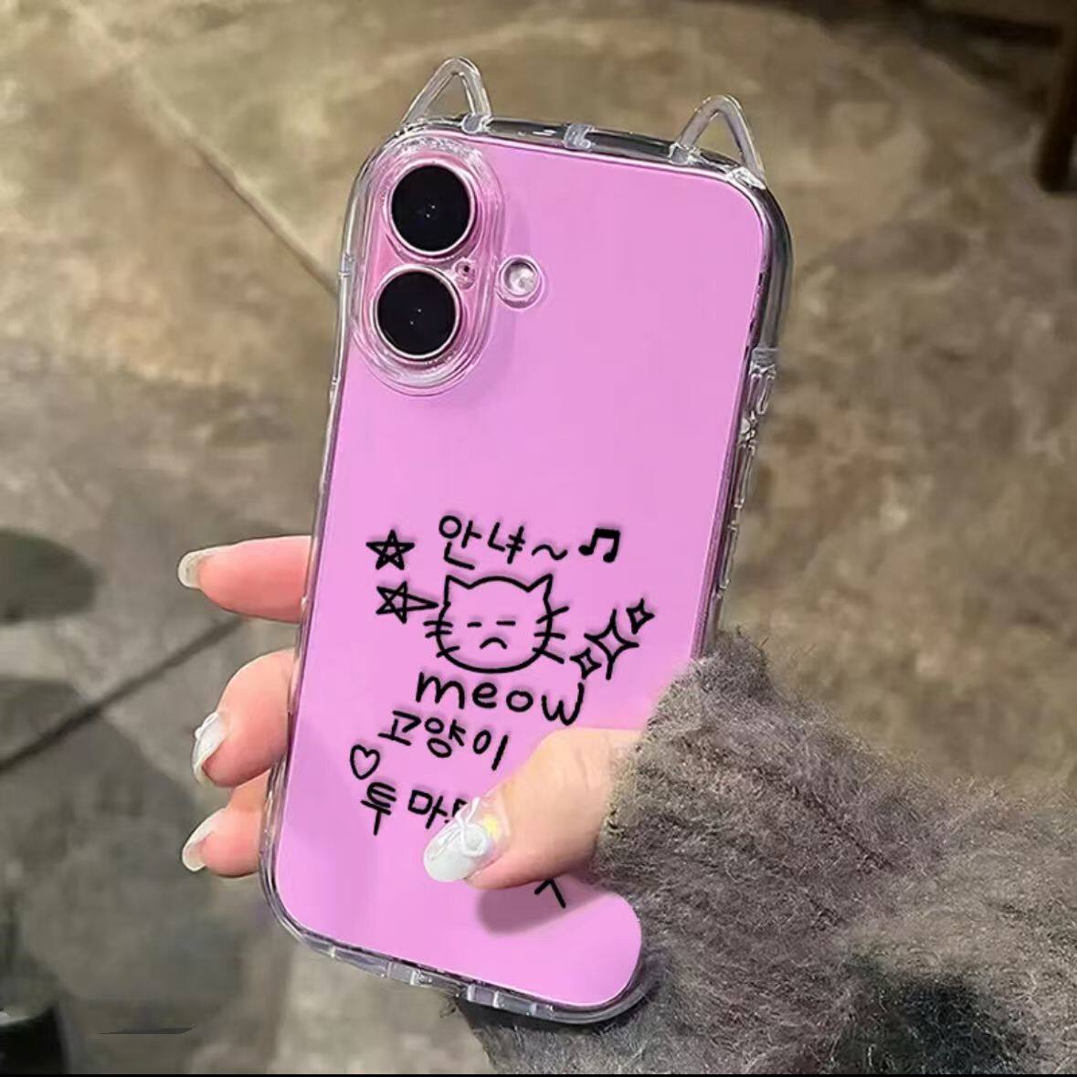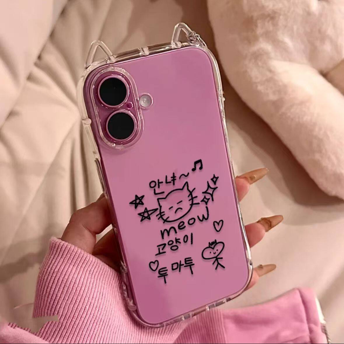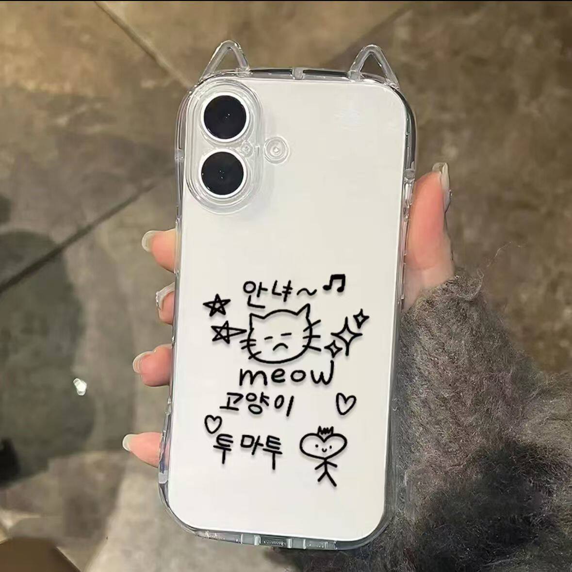 📚 韩文涂鸦小猫iiPhone17ProMax猫耳手机壳13/14plus不撞款16/15ProMax小众7/8透明11/12苹果x/xs/xr防摔保护套