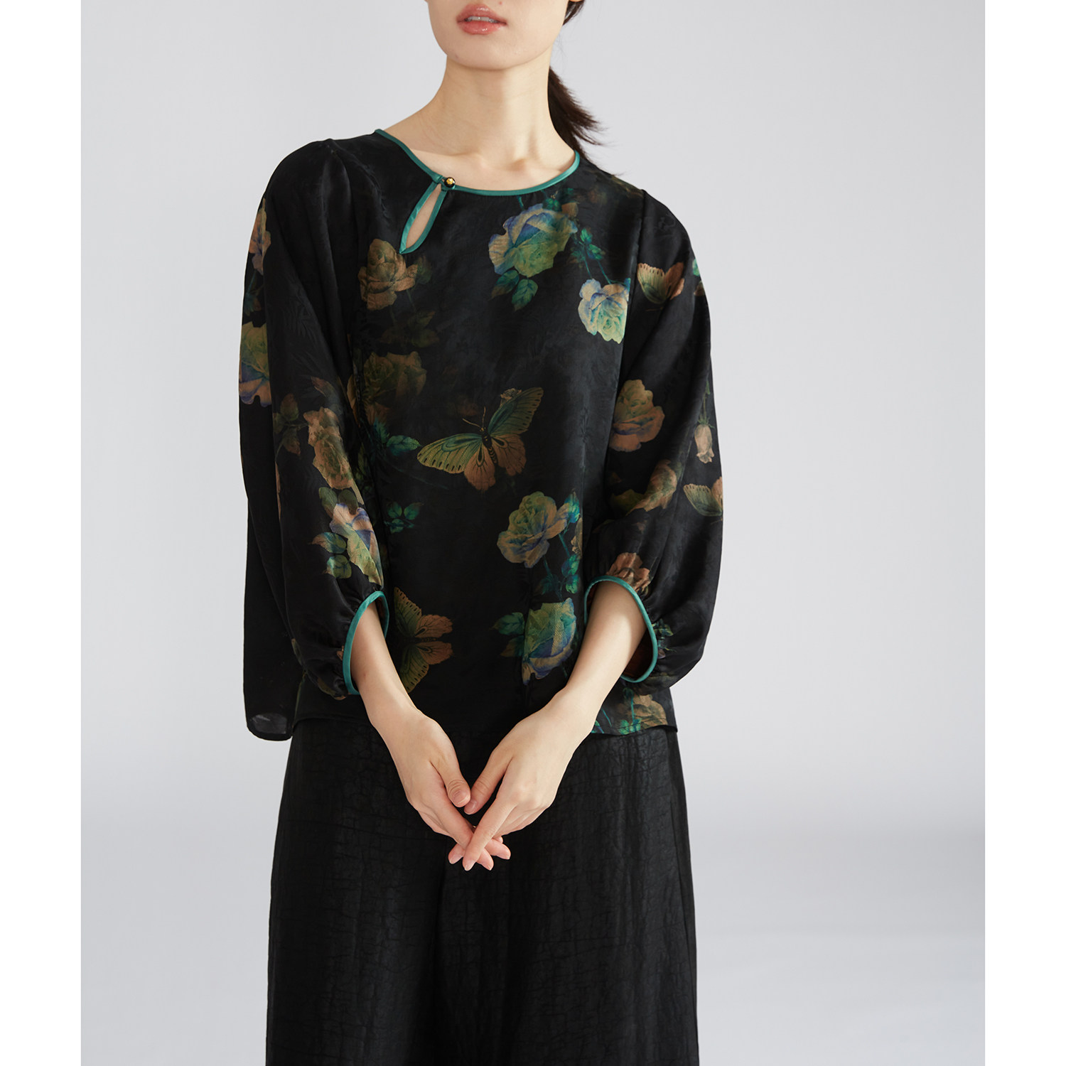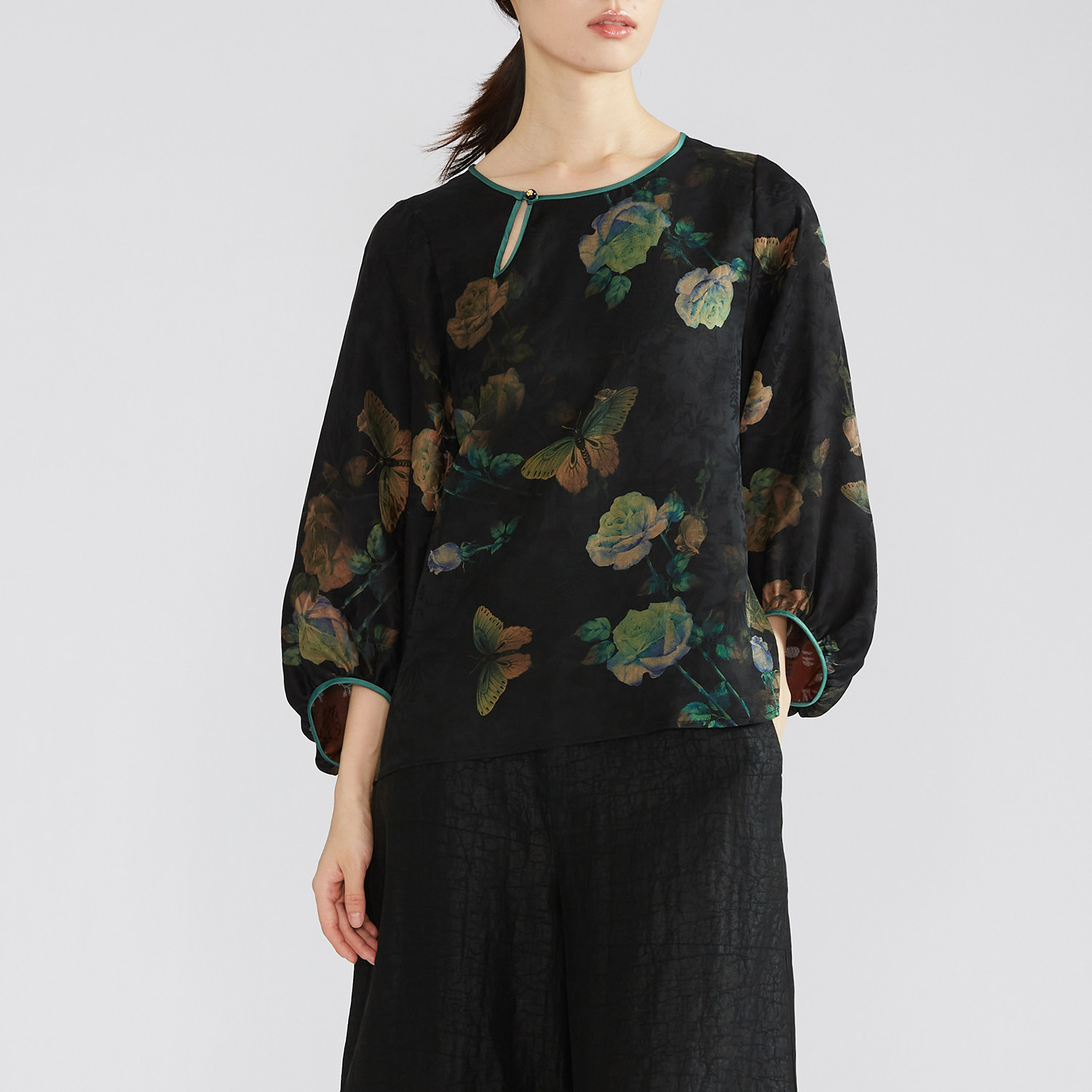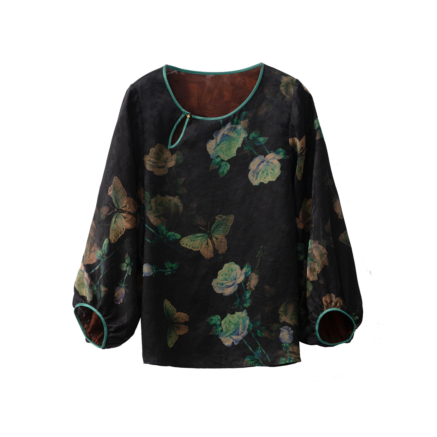 📚 一丝牵 真丝绞萝香云纱提花上衣女灯笼袖100桑蚕丝新中式上衣春季