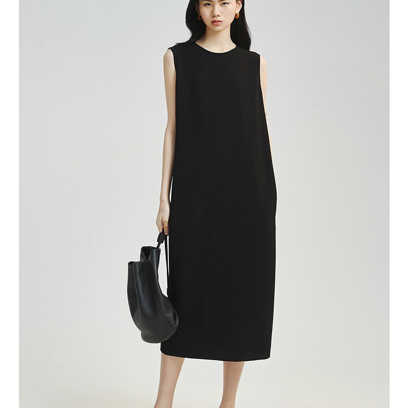 📚 三醋纤中长款连衣裙H型圆领无袖裙宽松显瘦开叉纯色高级感慵懒风