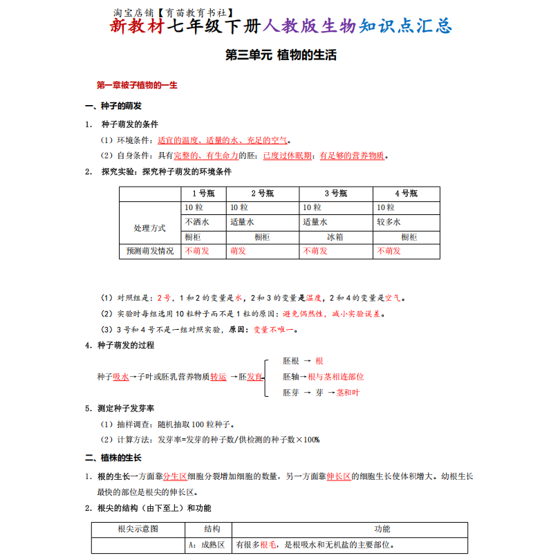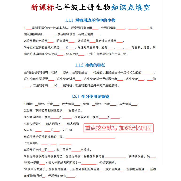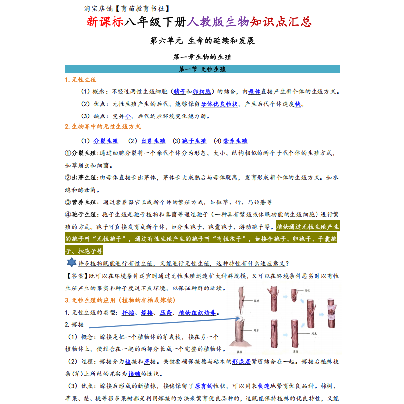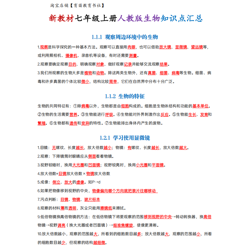 📚 26新课标人教版生物初中考七八年级上下册必背知识点汇总预复习本