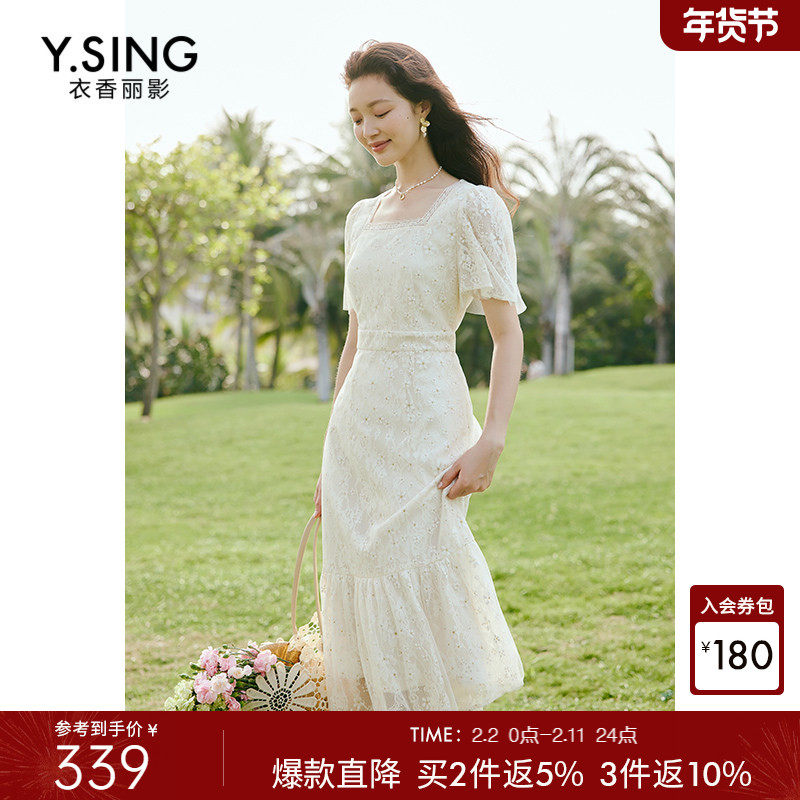 📚 白色方领蕾丝连衣裙女2025夏季新款高级感流行海边度假风法式裙子