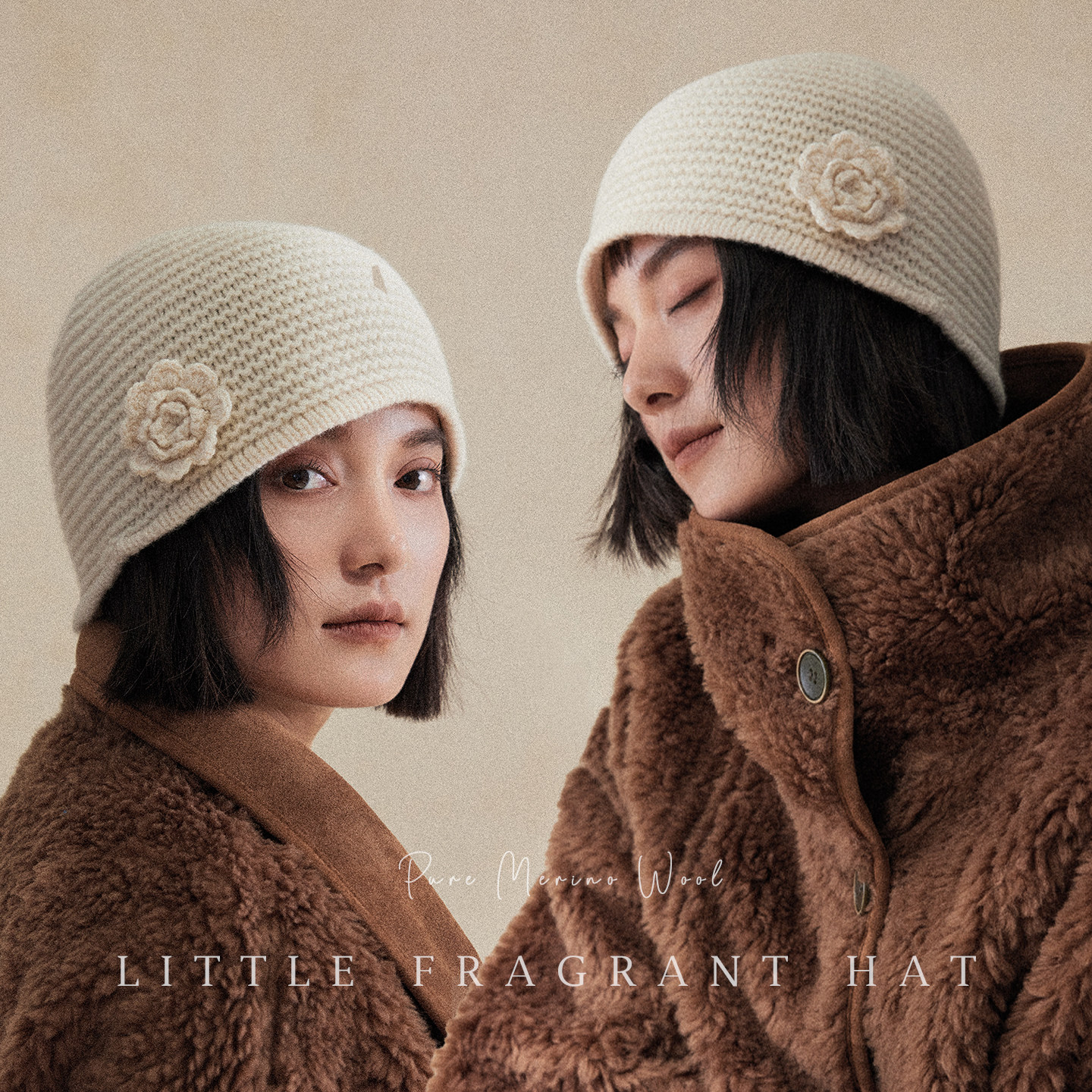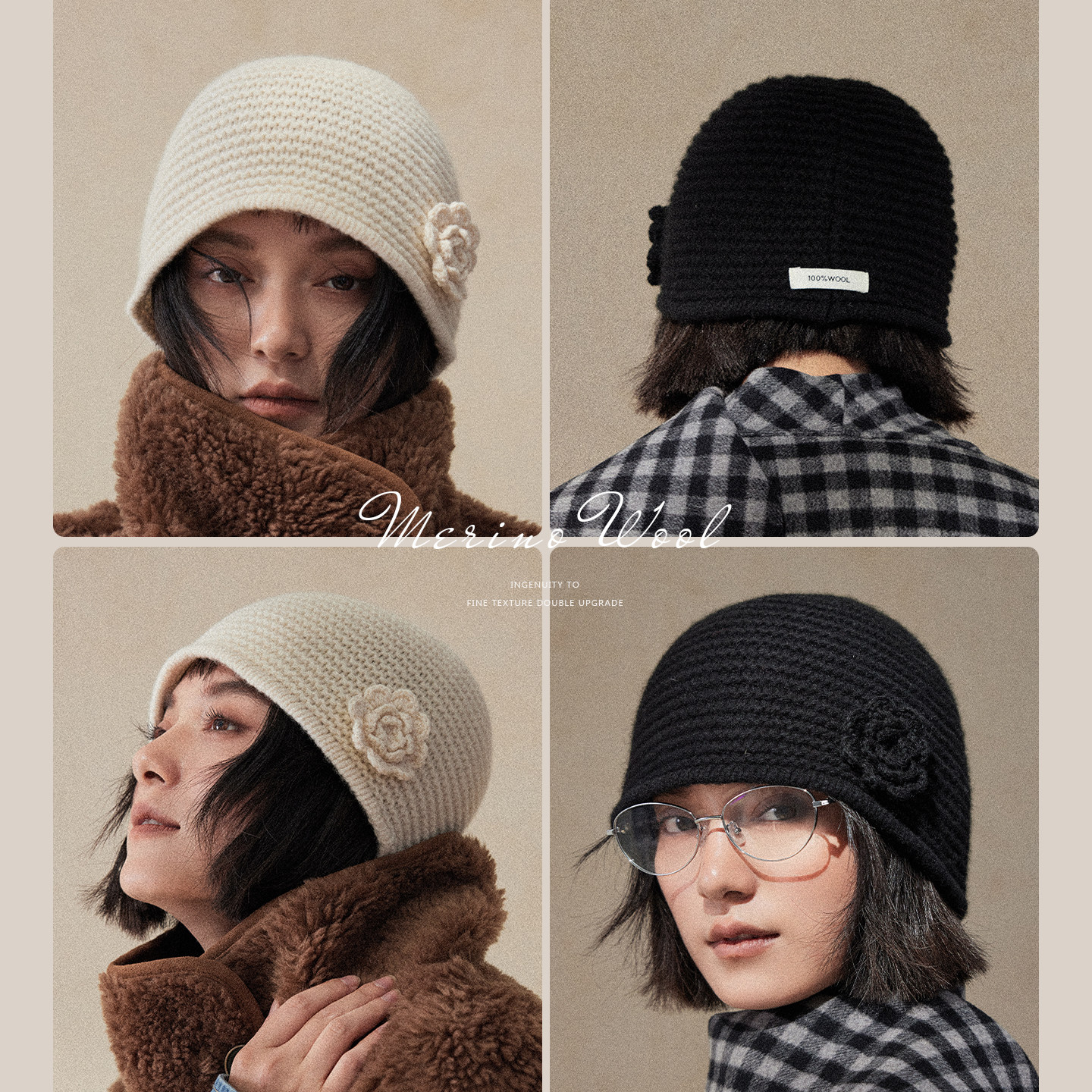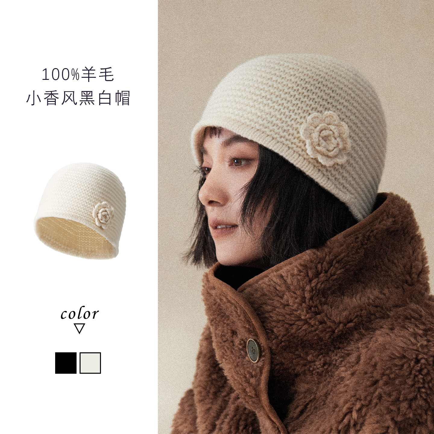 📚 盈妹温柔茶白丨优雅山茶花立体编织妈妈帽子冬季纯羊毛针织包头帽