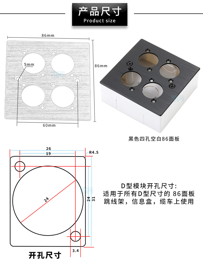 📚 黑色四孔铝合金拉丝空白86面板1位D型卡农网络音响音频两位插座白