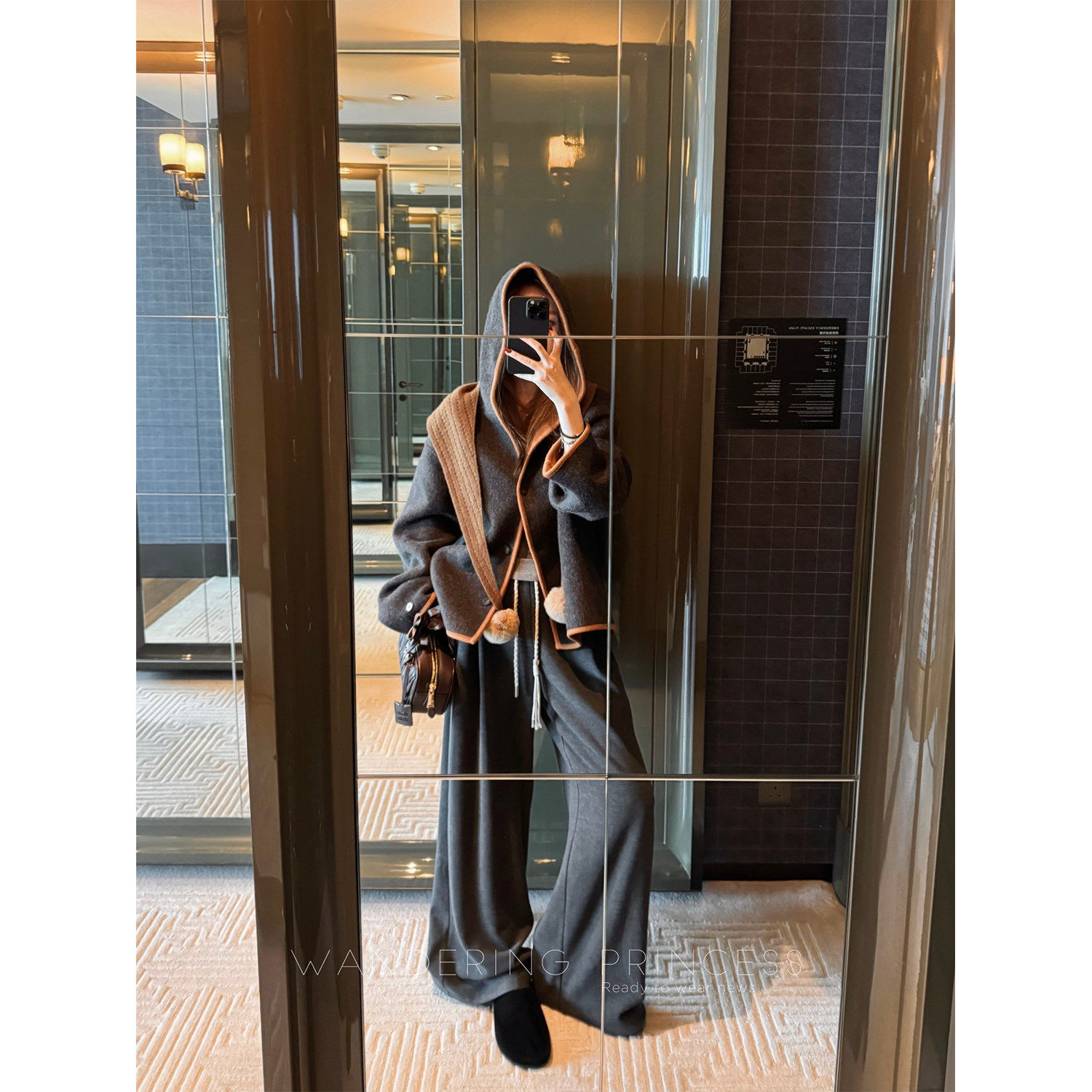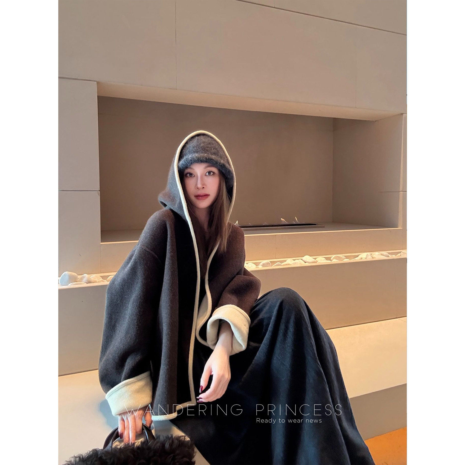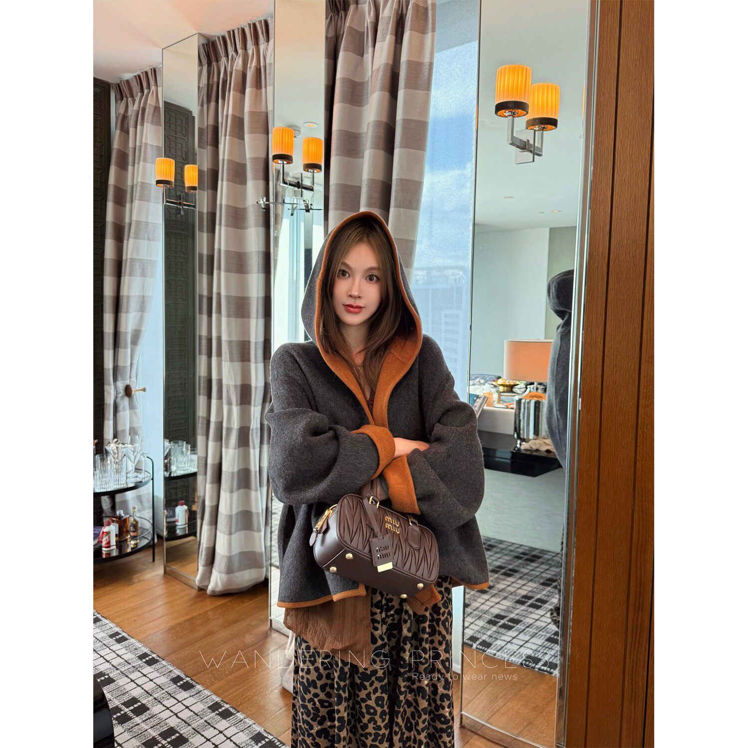 📚 钱美西90高支羊毛一手长双色双面呢连帽大衣撞色长短款毛呢外套女