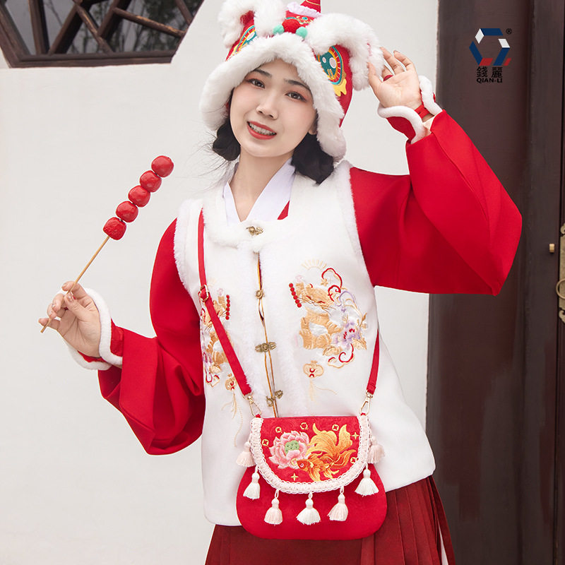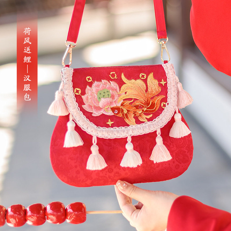 📚 古风汉服斜挎包包马年新年刺绣锦鲤儿童翻盖斜跨包女童流苏单肩包