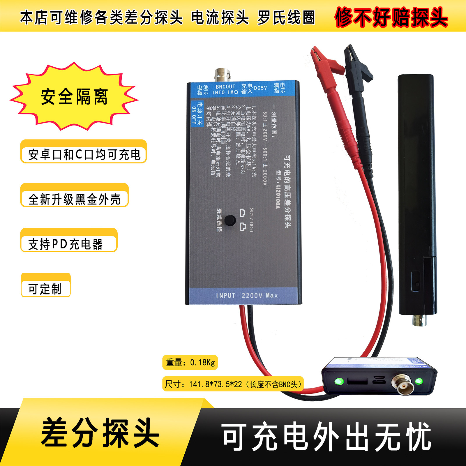 📚 示波器高压差分探头 100M 1500V 通用所有示波器品牌 隔离 可充电
