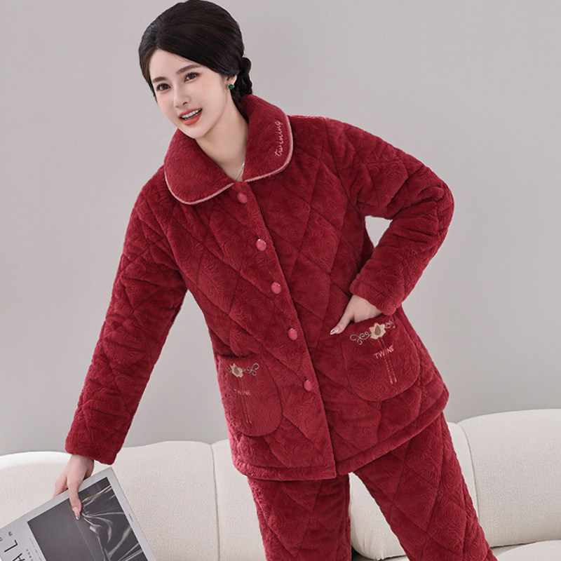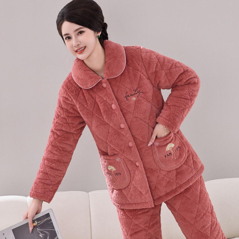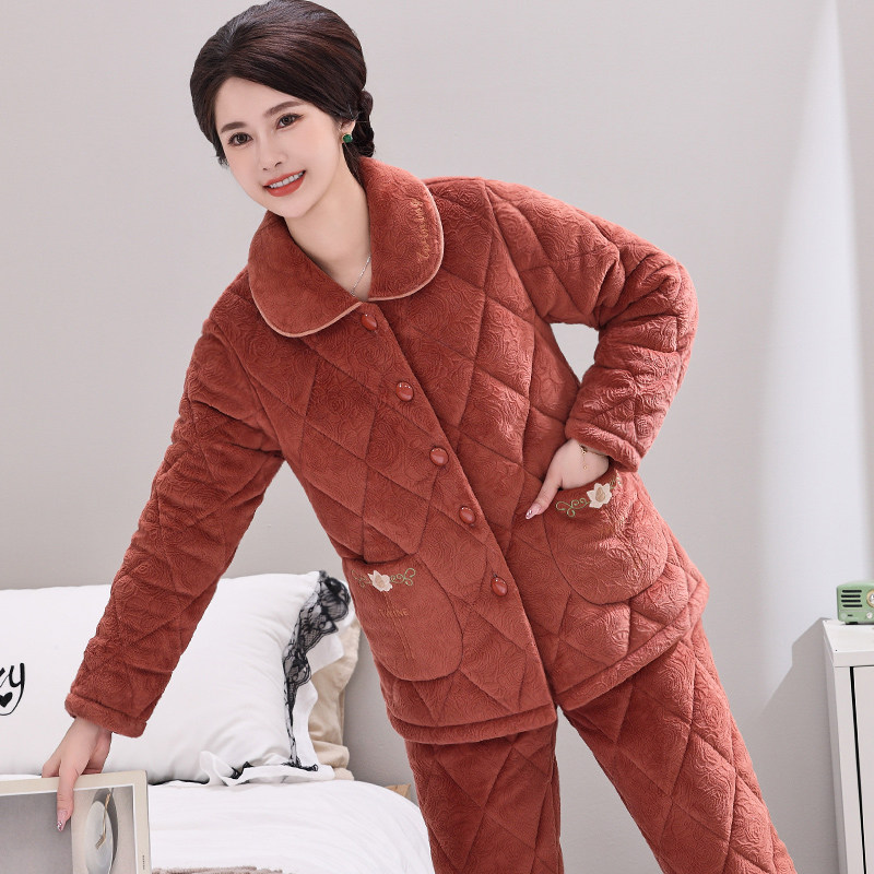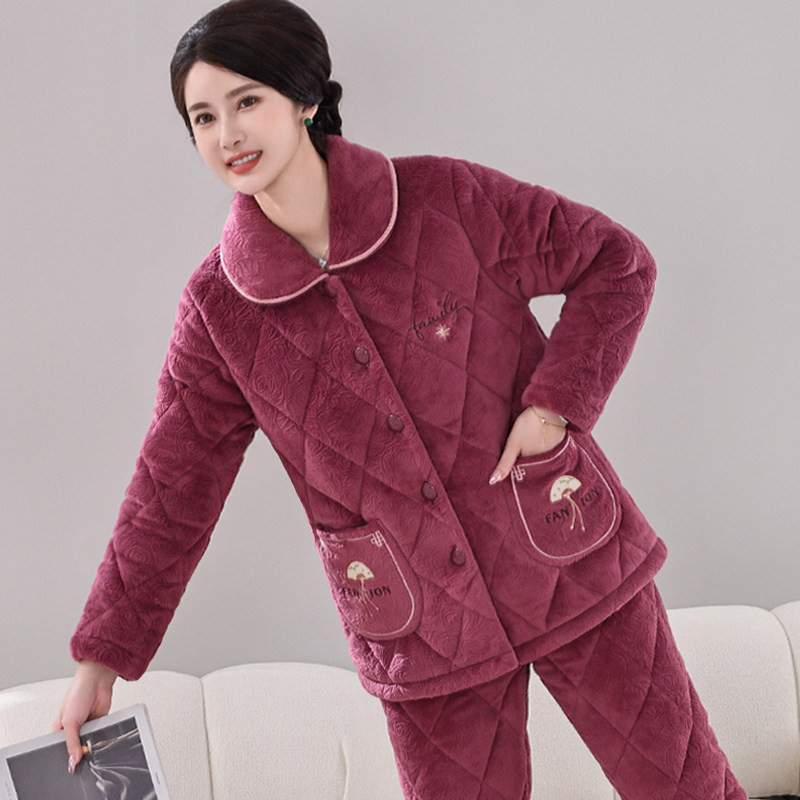 📚 秋冬季女士妈妈款睡衣三层夹棉珊瑚绒冬加厚加绒法兰绒家居服套装