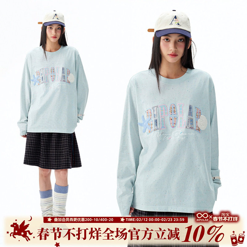 📚 BIPOLAR彩点贝壳织带贴布长袖休闲宽松圆领上衣打底设计感T恤春秋