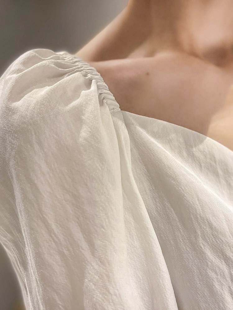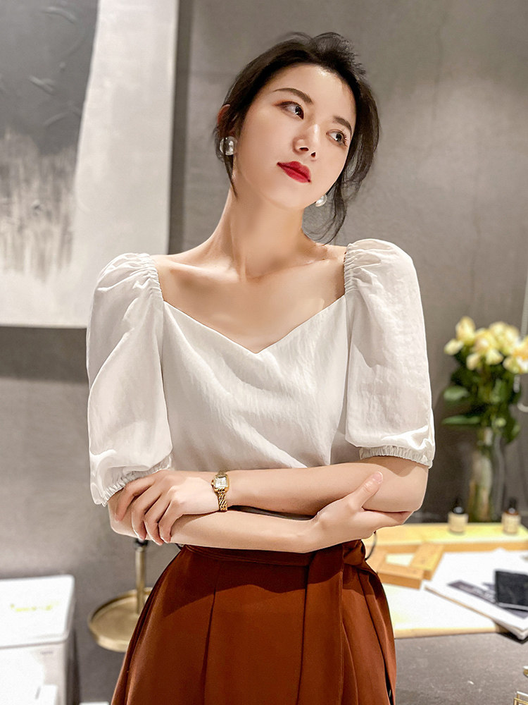 📚 2026法式方领上衣女夏雪纺设计感小众复古短袖泡泡袖显瘦锁骨衬衫