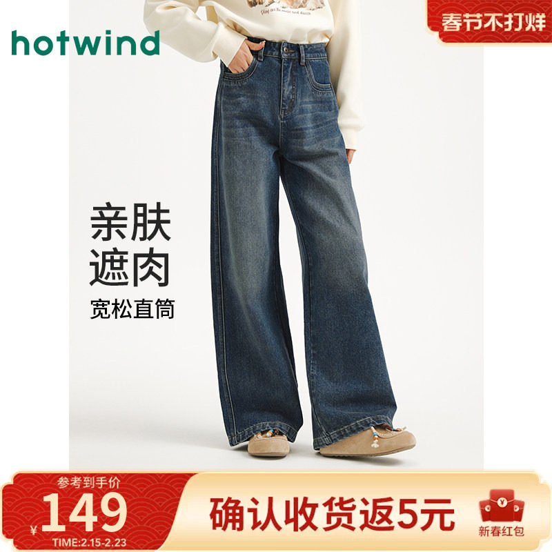 📚 热风女士加绒牛仔裤2025年秋季新款简约复古宽松牛仔裤亲肤遮肉