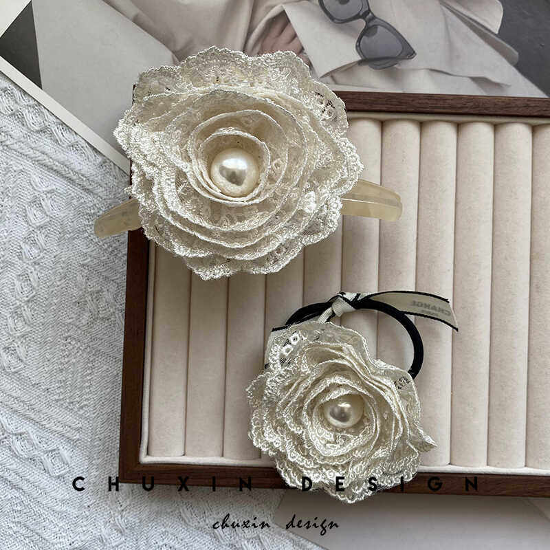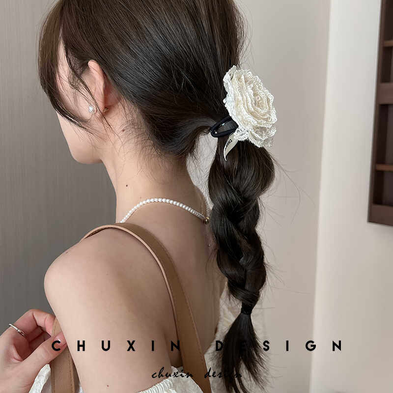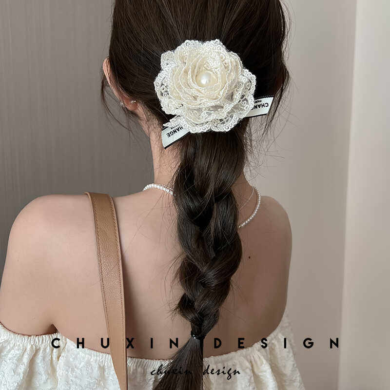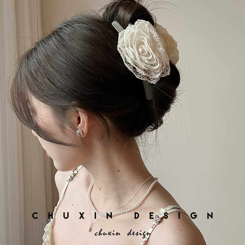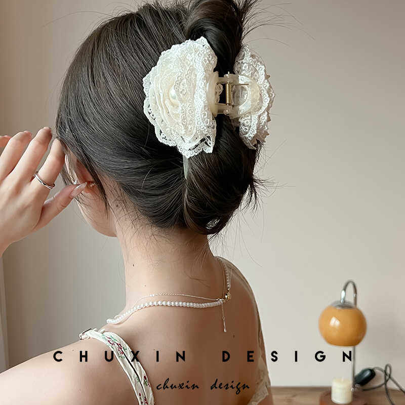 📚 复古蕾丝花朵抓夹女2024新款气质珍珠后脑勺盘发鲨鱼夹发夹多发量