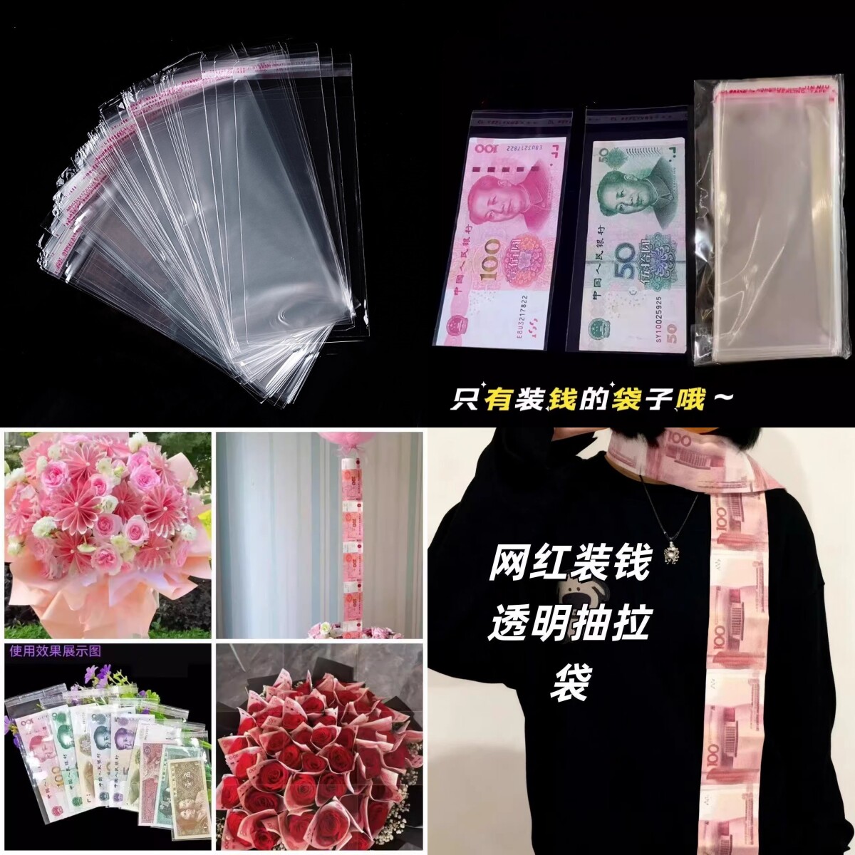 📚 网红装钱自粘袋透明袋蛋糕抽钱袋子拉钱袋扯钱袋纸币收纳有钱花