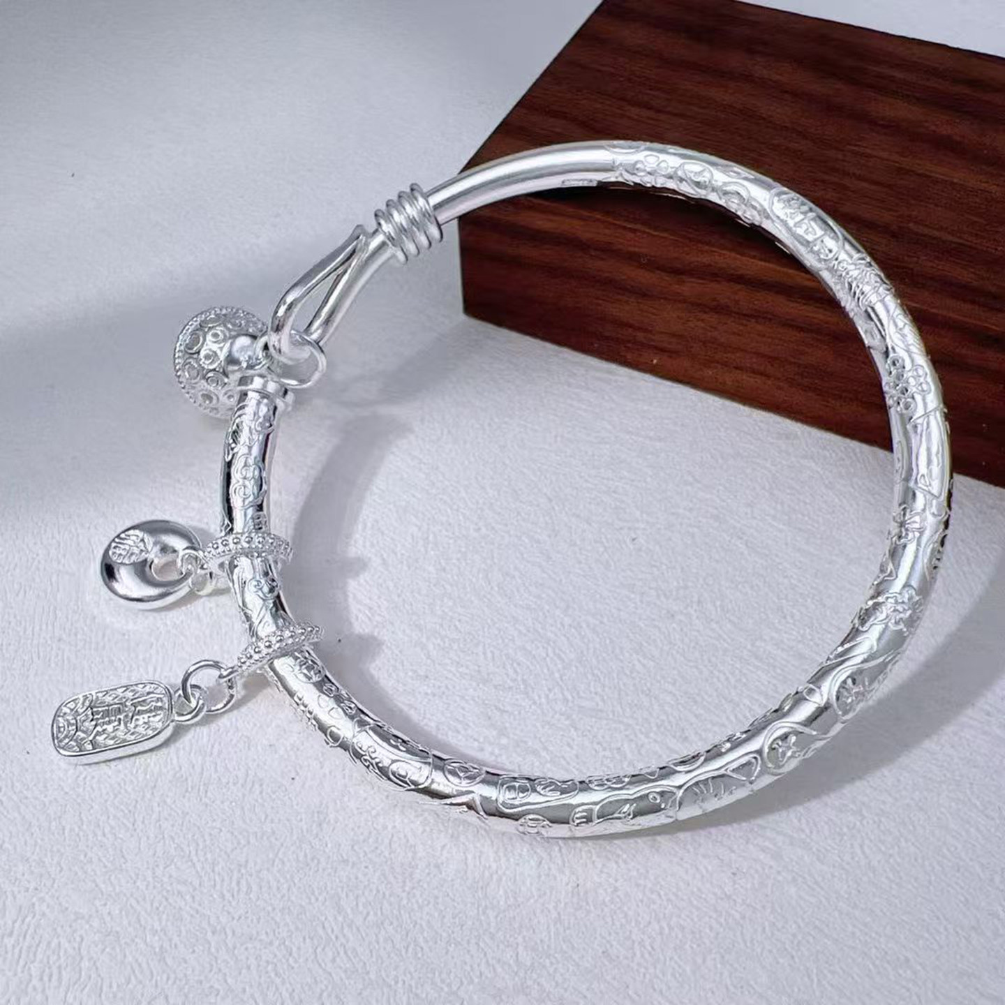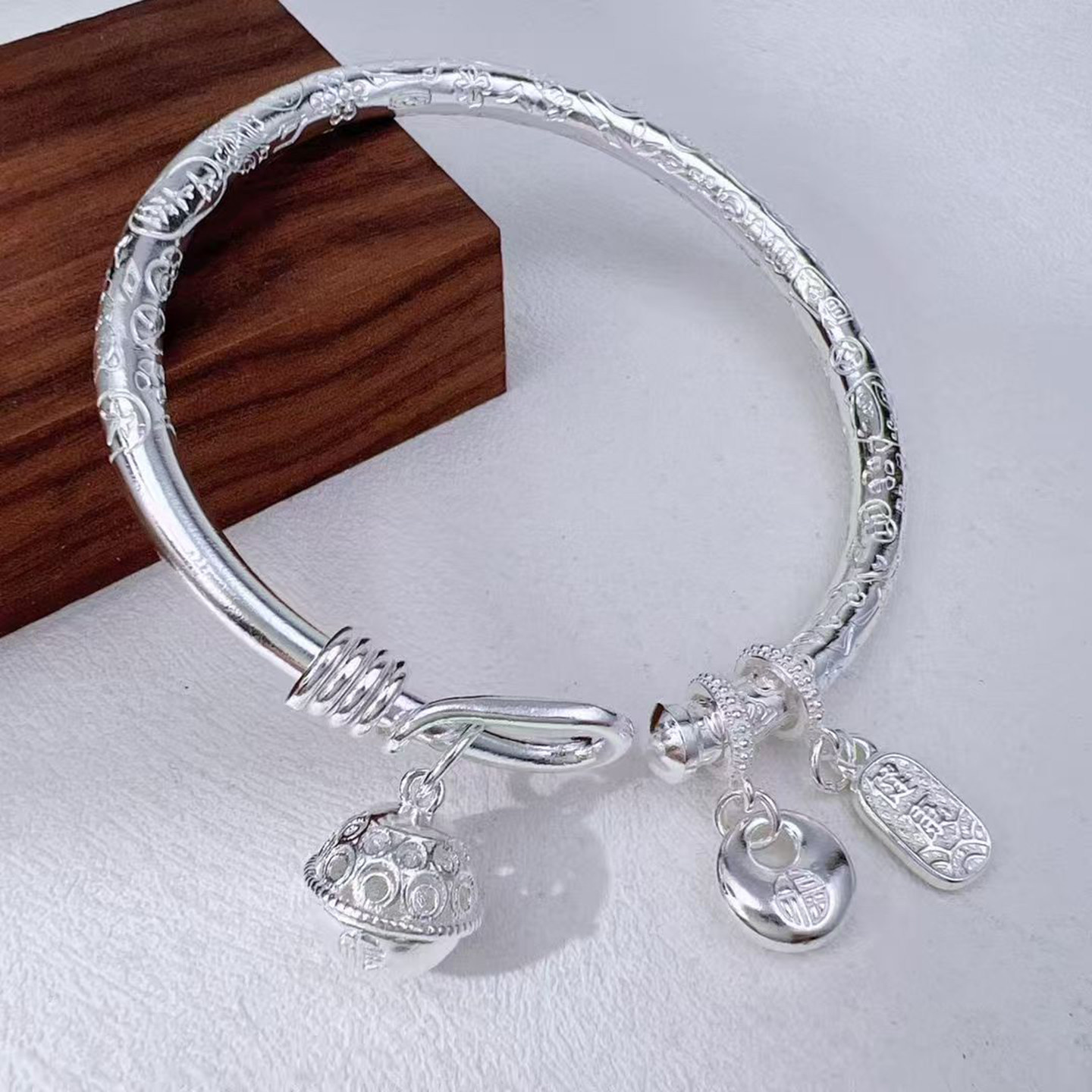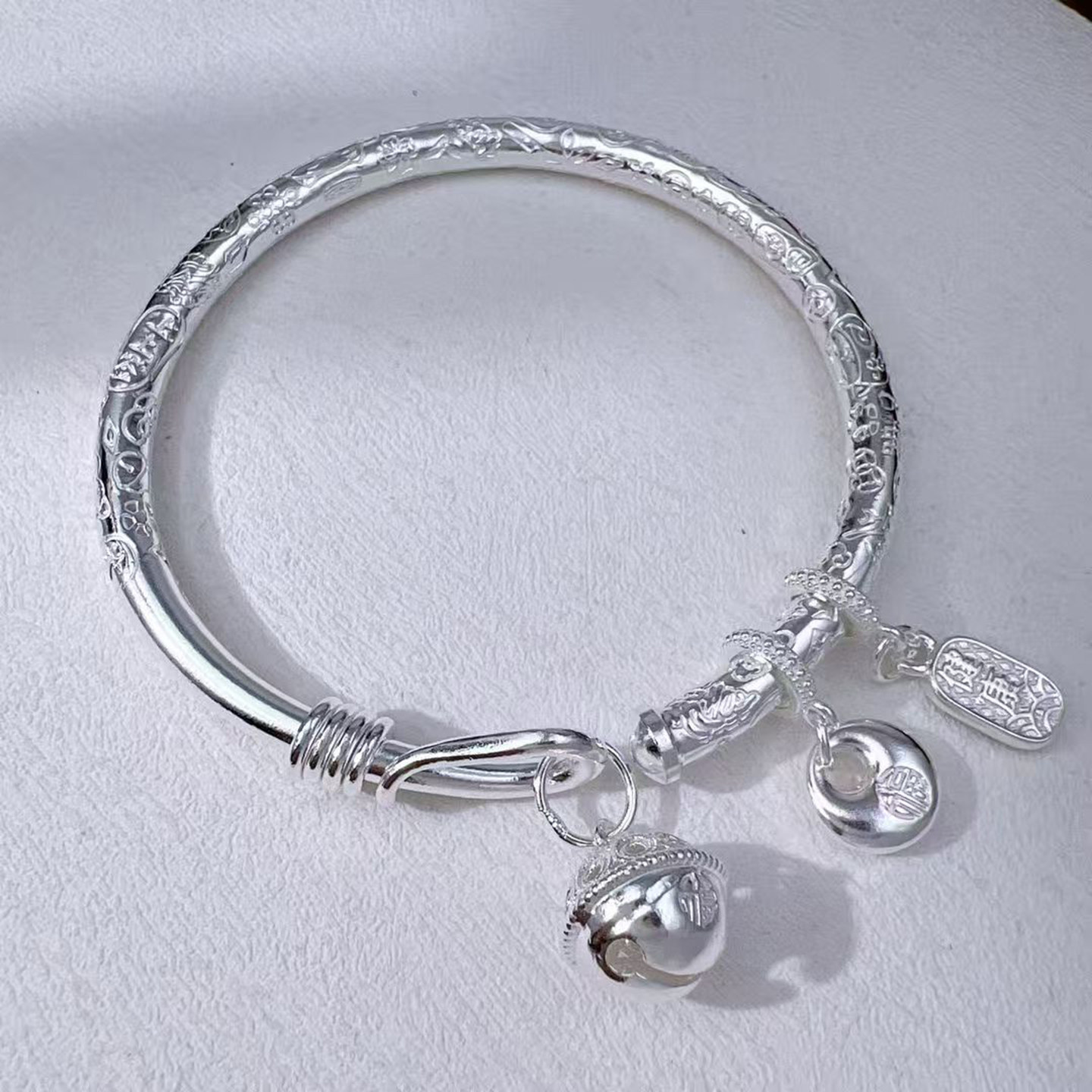 📚 吉言盘缠手镯女9999足银国风新中式宫铃小胖福开口纯银镯子送女友