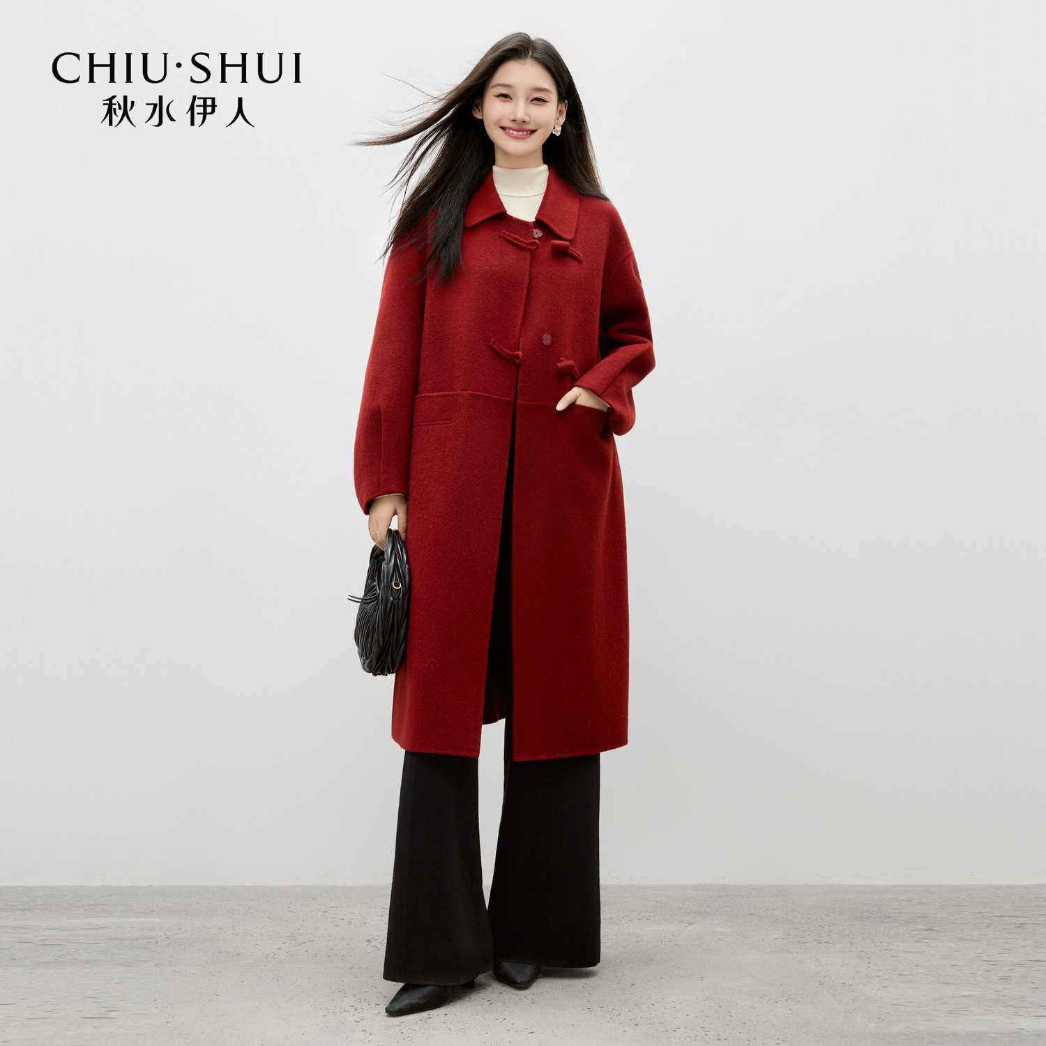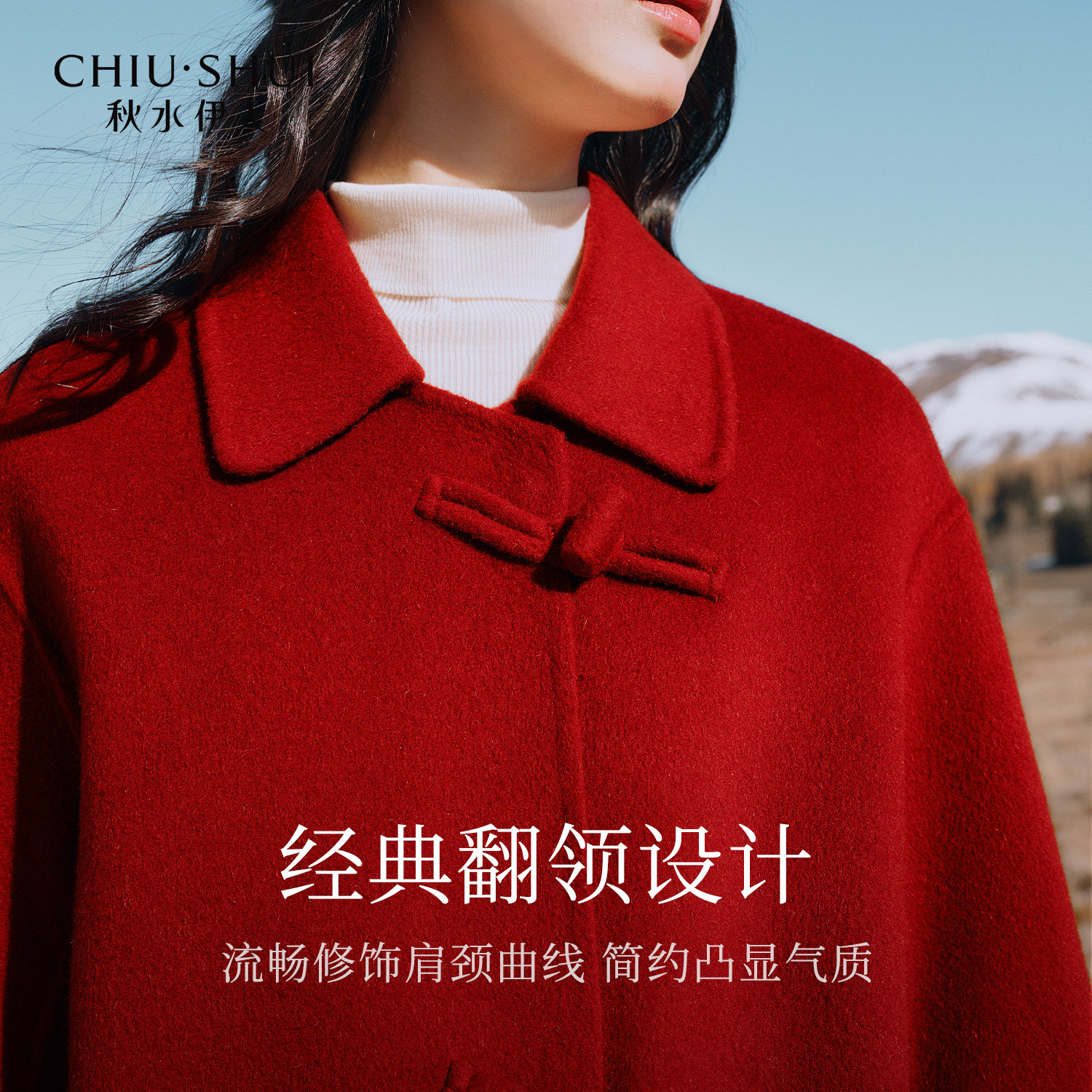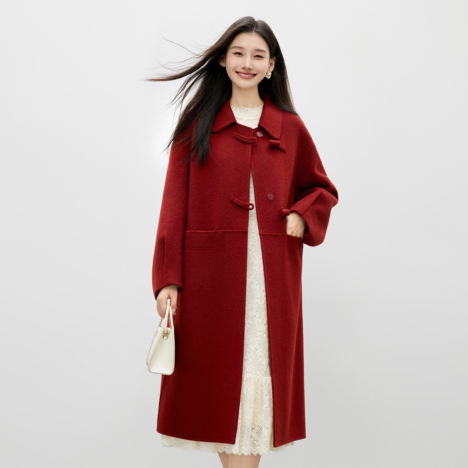 📚 秋水伊人气质翻领羊驼毛毛呢大衣女2025冬季新款落肩宽松红色外套