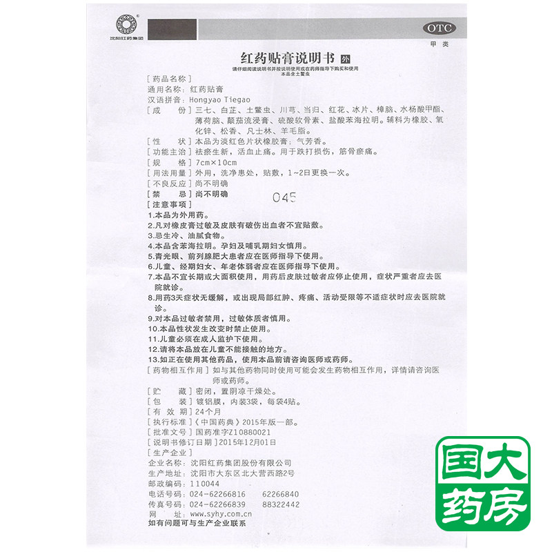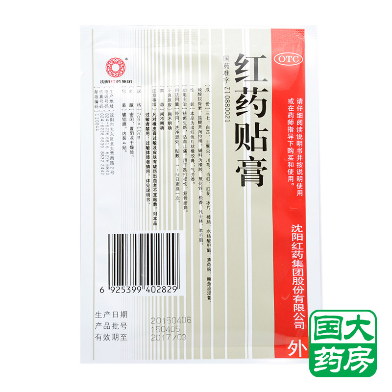 📚 沈阳红药集团 红药贴膏 4贴/袋祛瘀生新活血止痛跌打损伤筋骨瘀痛