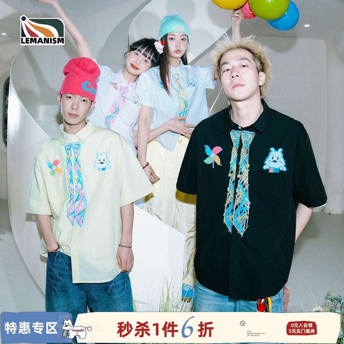 📚 lemanism卡通学院风彩绘涂鸦小狗短袖衬衫男情侣款衬衣女2025夏季