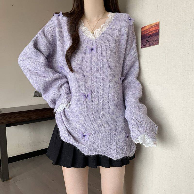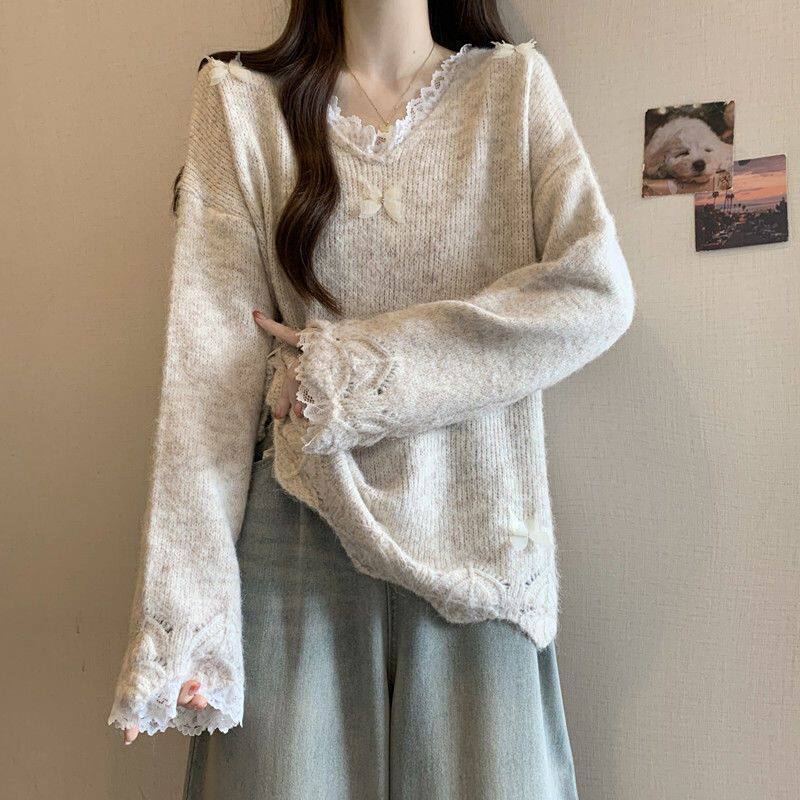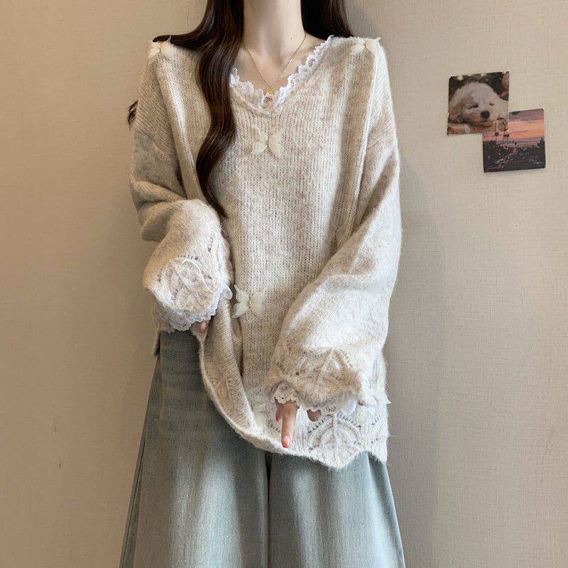📚 鹿向南「云絮蝶梦」燕麦色宽松长袖针织衫毛衣女初秋质感温柔上衣