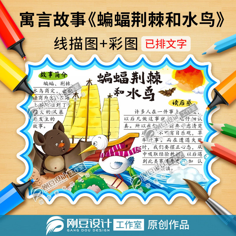 📚 伊索寓言故事蝙蝠荆棘和水鸟读书卡模板彩图线描图阅读卡电子版