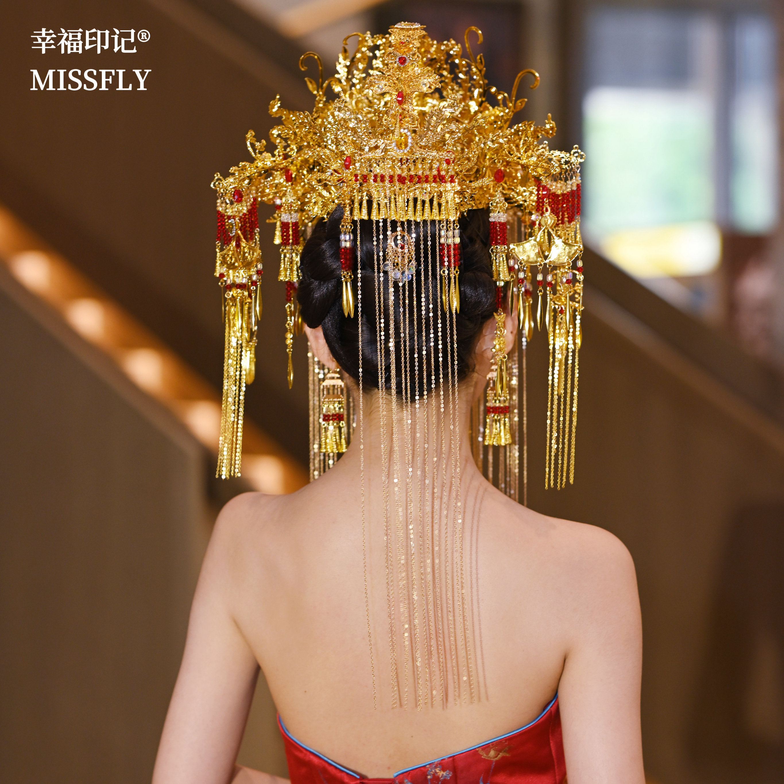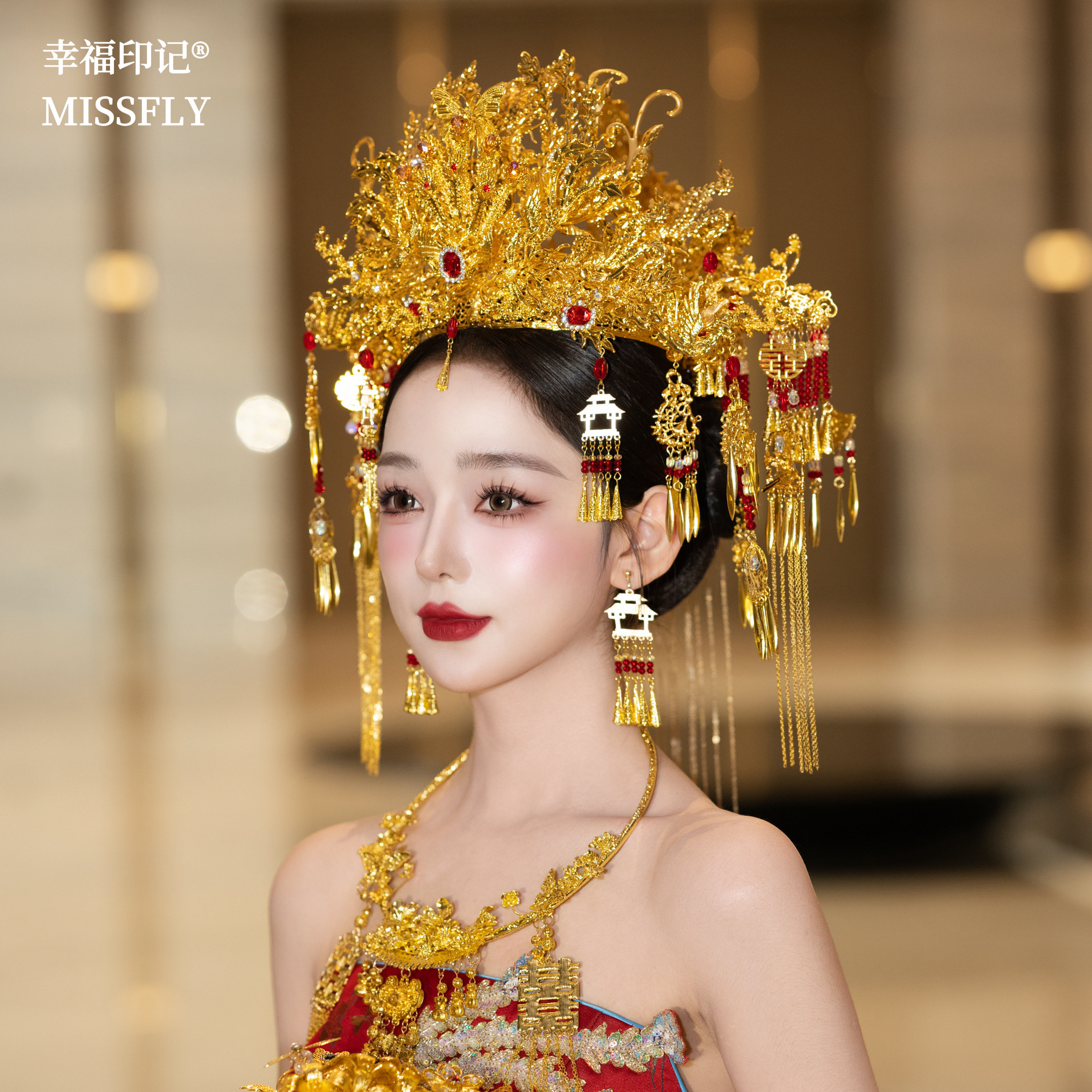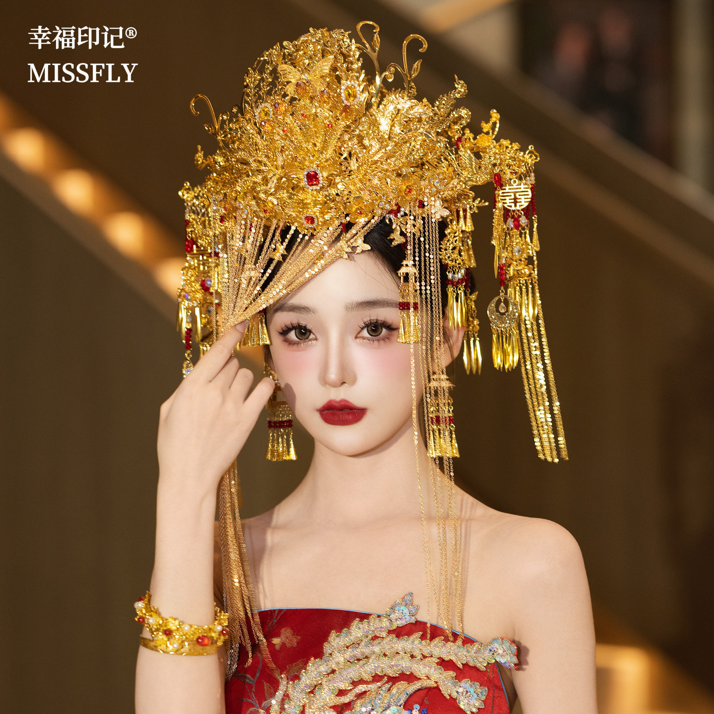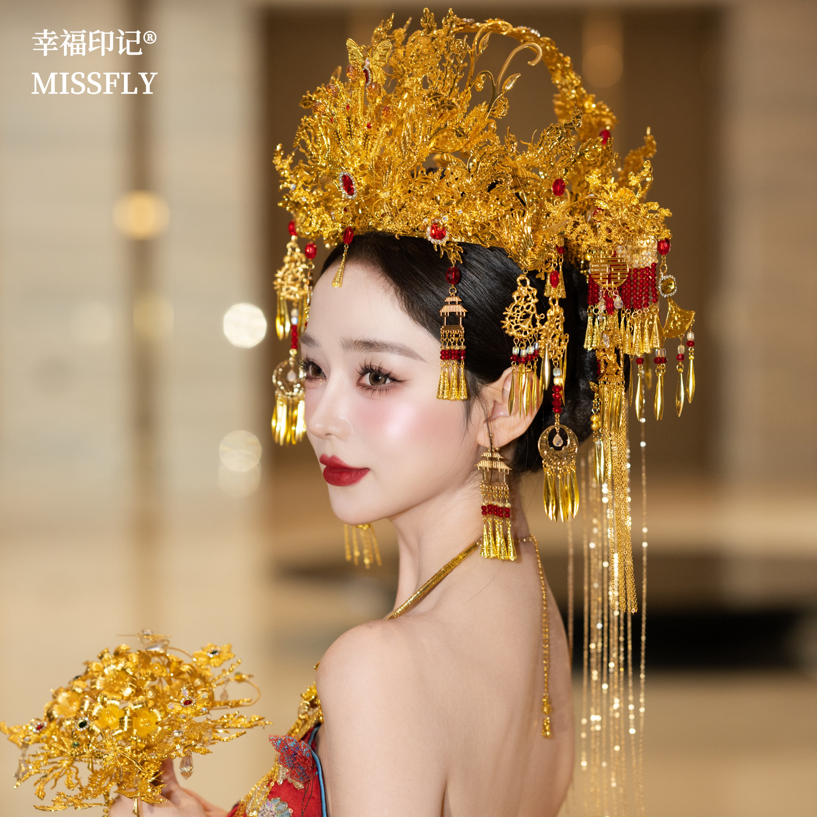 📚 金色面帘大凤冠整冠新娘中式婚礼头饰汉服秀禾龙凤褂敬酒礼服发饰
